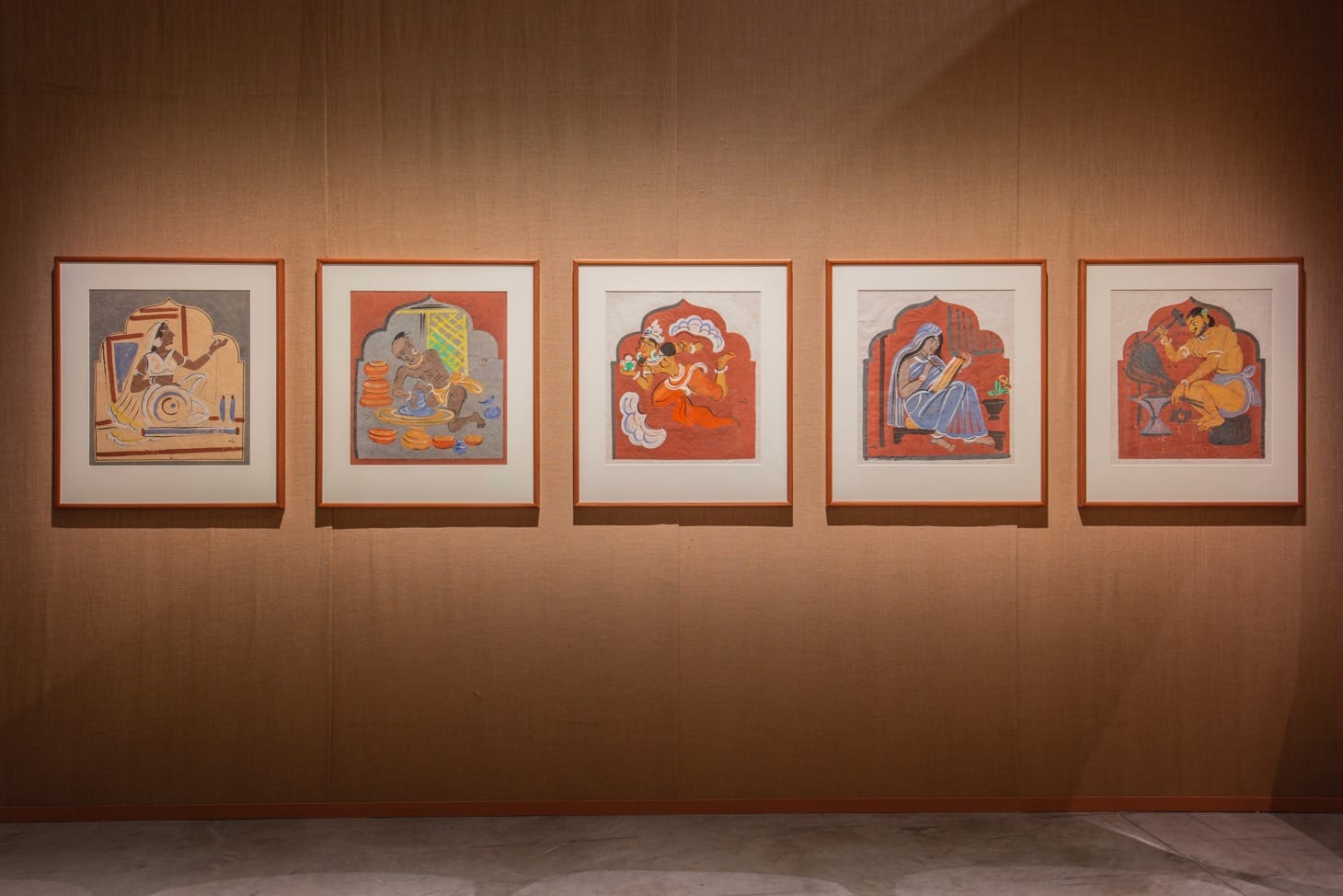 “Gandhi wanted Bose to represent the dignity of labor, which was a way to get out of the inferiority complex that came from colonial rule,” said Karode. It was also a way to resist British industrialization, which, by the 20th century, had begun forcing Indians to purchase machine-made textiles from British manufacturing companies. Bose painted scenes of women splitting husks of grain and pounding rice, potters at their wheels, and farmers out in the paddy fields. He used natural pigments from crushed vegetable and stone, and made the panels from thatch, bamboo, and hand-spun cotton. The artist’s turn to the pastoral was a defiant act of decolonization.