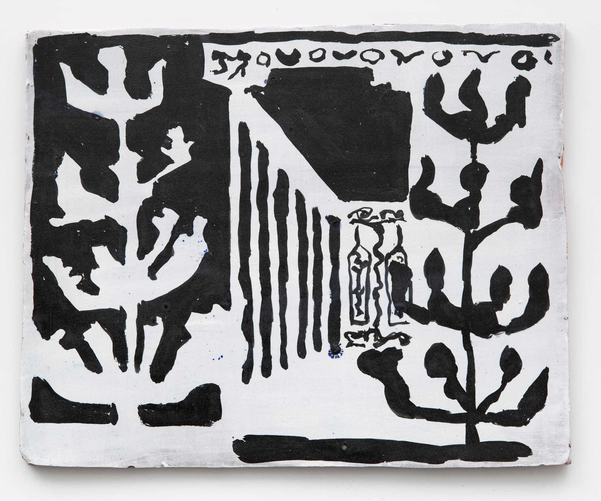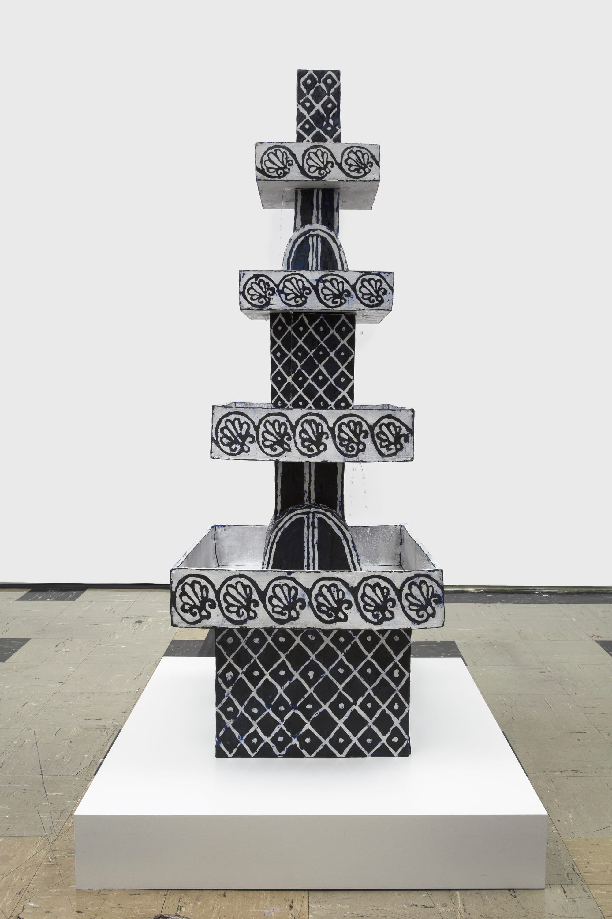 The ultra-colorful glazes on Kley’s stools and planters remind me of campy talavera homeware and Dalí’s foray into ceramics, while her painted trompe-l’œil walls are evocative of palazzos at night. But her defining works here are two functioning earthenware fountains — “Fountain with Arches and Nautilus Border” and “Fountain with Crescents and Leaves” — that succeed more than anything else on view in establishing the show’s lush and absurd sense of place.