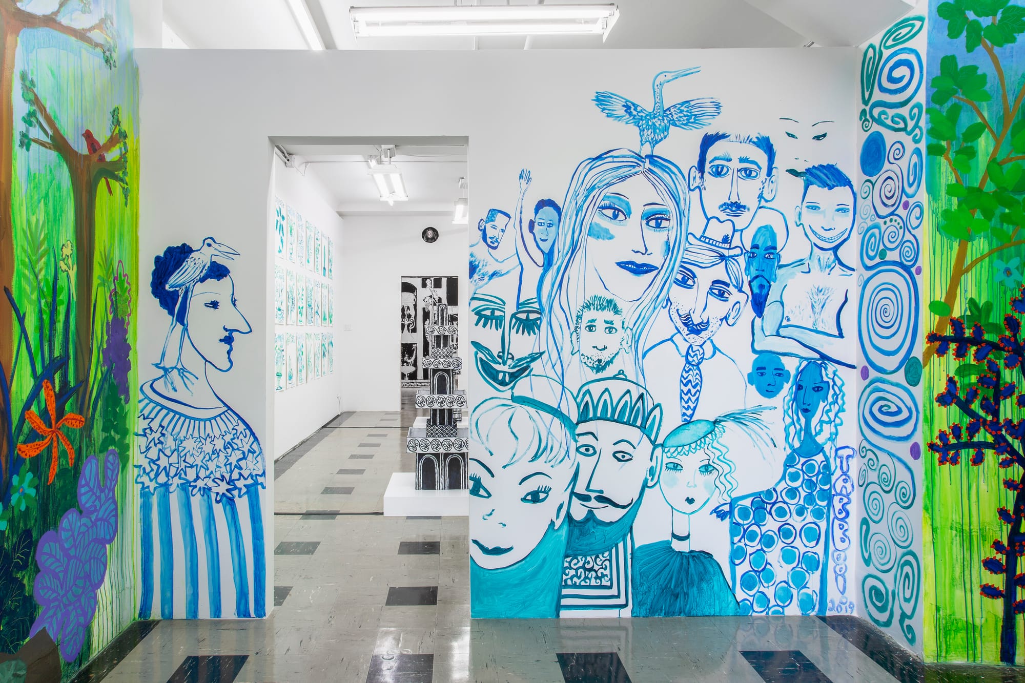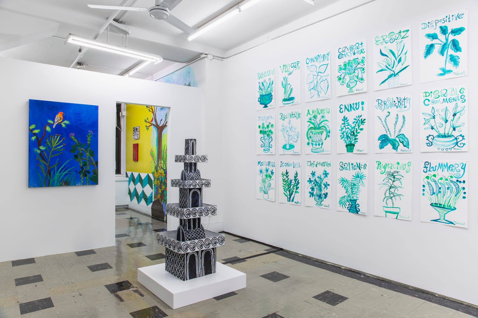Garden: Elisabeth Kley and Tabboo! at Gordon Robichaux is gaudy, ornate, and all the better for it. The site-specific installation by painter and performer Tabboo! (aka Stephen Tashjian) and sculptor Elisabeth Kley brims with the joy of creation, of friends ploughing past received ideas of taste and history to reach the viewer on the level of pure pleasure. In its contained air of hothouse cheer, the artists offer their hands to walk you gaily among the flowers.