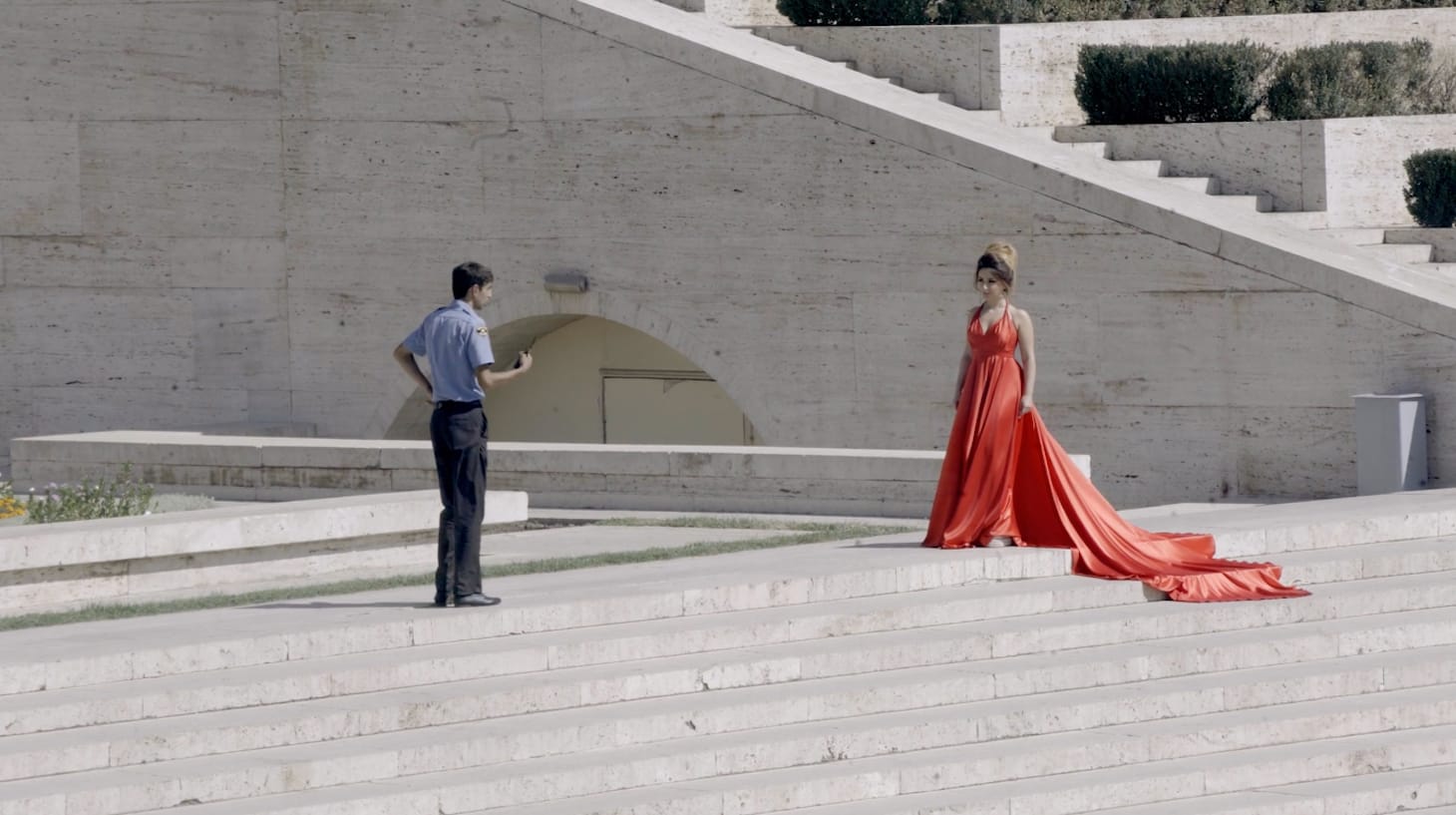The penultimate piece in the Los Angeles Filmforum showcase was a digital video created roughly 25 years after Girl From Moush, after the artist’s repatriation to Armenia, An Inventory of Some Strictly Visible Things (2017). An Inventory also begins with a telephone: a shot of a smartphone with the weather app loaded, indicating that it’s 20 degrees Celsius and sunny in Yerevan. The artist writes the date in her notebook: September 21, 2017. She catalogues all the objects within her line of sight, from quotidian rocks, lamps, and Armenian alphabet blocks to a woman in a floor-length red ballgown making a surreal daytime appearance on the stairway of the Yerevan Cascade.