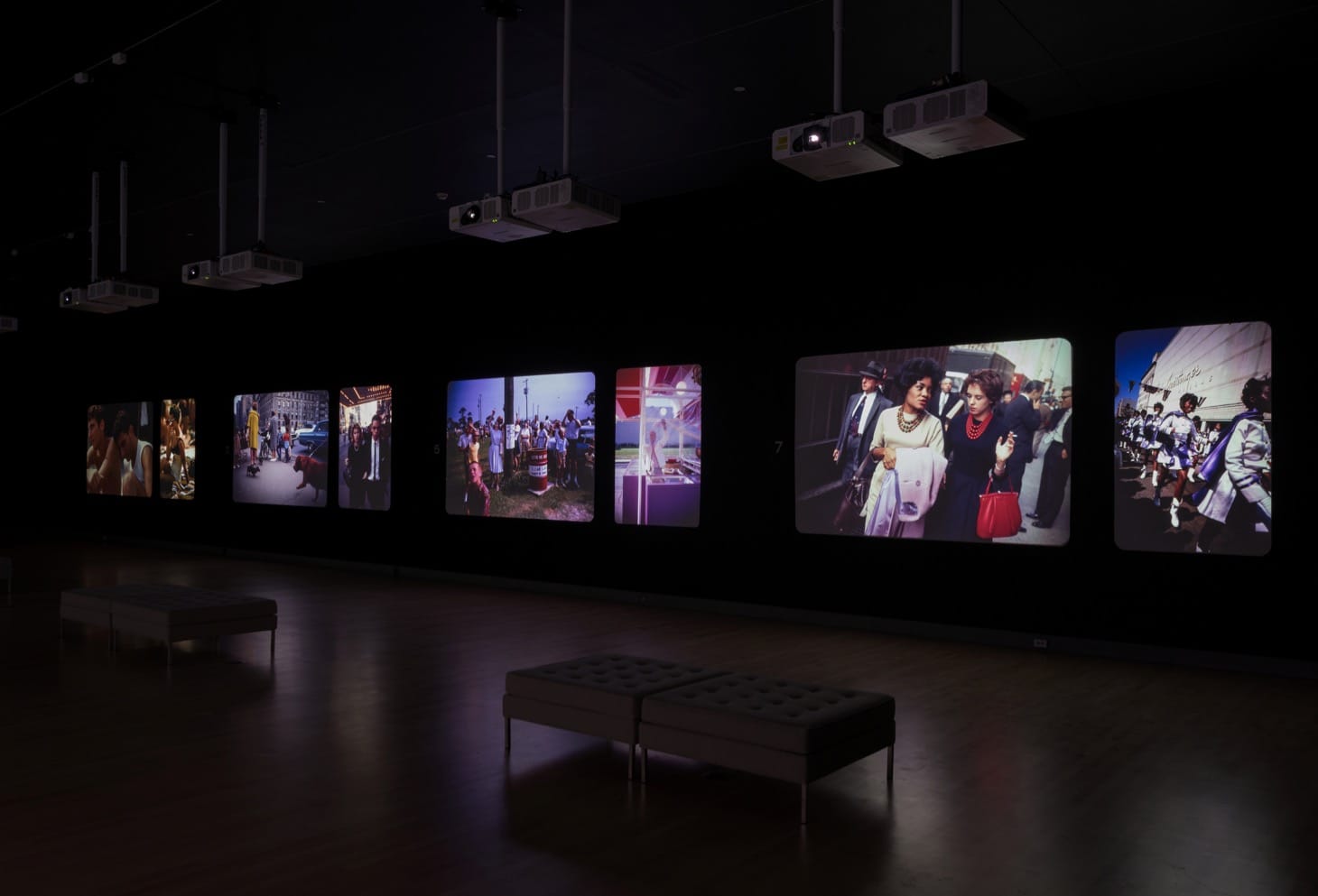 The first time I saw the Garry Winogrand: Color exhibition at the Brooklyn Museum, I thought that I heard music playing. There was nothing in my notes to corroborate this false memory. Yet, when I stepped into the darkened gallery the second time, I did honestly expect to hear something plaintive and kind, languorous and poignant. Though that music only exists in my head — something perhaps like Rachel’s Music for Egon Schiele — the show lingers in my consciousness like a song that’s found my frequency. I suppose this response is helped along by the arrangement of color slides in the gallery. They wink in and out of existence. The images are paired in small visual novellas. One is displayed along a horizontal axis and the other along a vertical one. The horizontal images tend to last around seven seconds and the vertical ones almost twice as long. Over time this makes for distinctly different juxtapositions as the various images cycle through.
