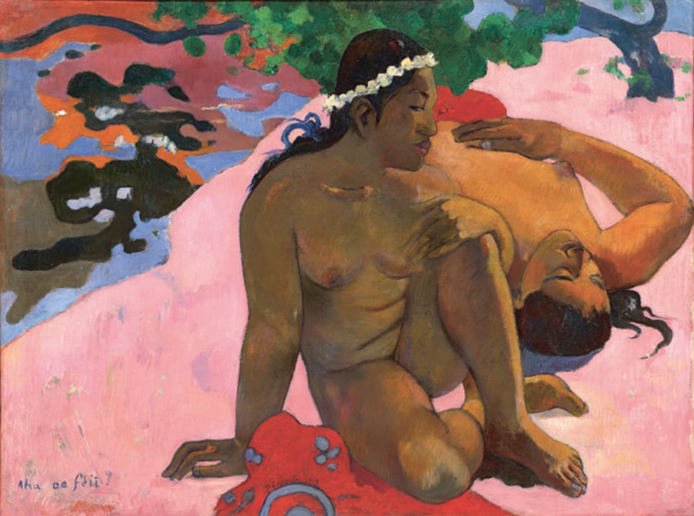 In general, Gauguin seems to me inspired by the opinion that non-Western cultures are (or were) purer, more likely to be motivated by instinctive movements of the heart, more magically authentic, and thus morally closer to what humanity should be. A place where sexual relations are unrepressed and playful and mutually satisfying. In the Marquesas and Tahiti, boys and girls (even then) were sexually active at puberty and usually initiated into sexuality by an adult, but when Gauguin pulled into Papeete to check-out the piquant sites, he was quickly disappointed. The Tahiti capital was full of his fellow French nationals. Quelle horreur! Tahiti had been discovered by the West in 1767 and the first missionary expeditions were organized only thirty years later. It became a French protectorate in 1842 and by the time of its annexation in 1880, all local traditions and beliefs had been banned. So Gauguin had to partially invent an imaginary ideal Polynesia of free sex, a voluptuous Polynesia-of-the-mind in a land of considerably unrepressed sexual liberation.