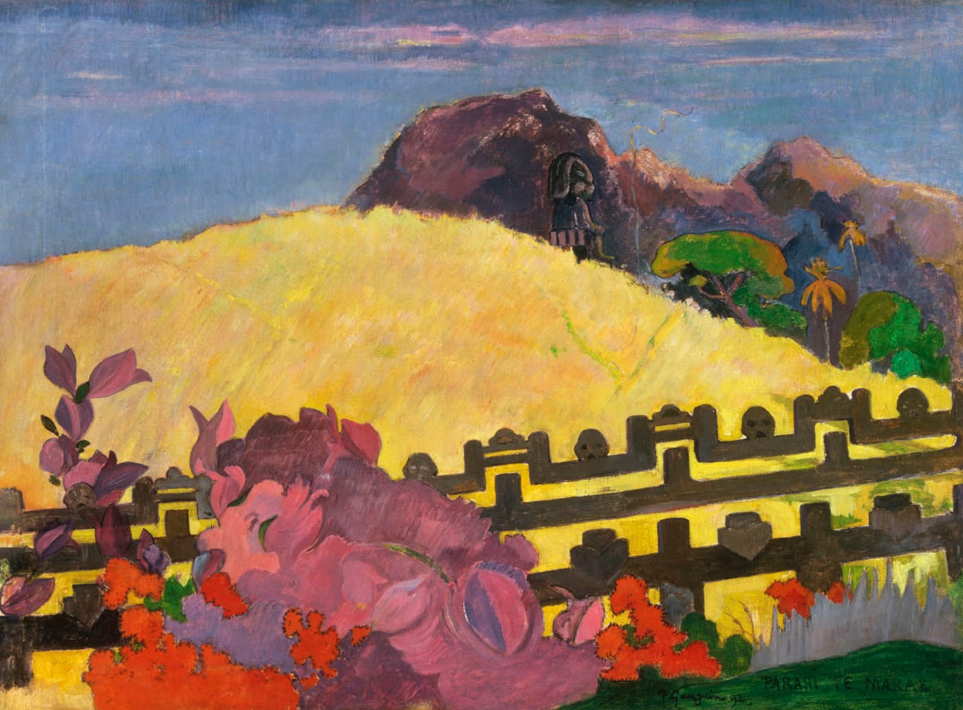 Scrutinizing Gauguin as rapacious sexual louche, self-promotional plagiarist and loquacious raconteur may be no fun, but it’s part of the ongoing meditation on how to regard effectual art made by flawed men. His stimulating vibrant color harmonies as applied to nubile young women — titillatingly laid out on a flat picture plane — most definitely impacted the Western canon of Modern Art. It provided stimulus and succor to Pablo Picasso for his “Les Demoiselles d’Avignon” (1907), for one. But Gauguin’s representations of fully naked young Tahitian girls — as in “L’invocation” (The Invocation, 1903), where he was one of the first Western artists to paint pubic hair, or semi-naked, such as in “Aha Oe Feil?” (“Are You Jealous?”), from 1892 — reflect by our standards an unartistic sexual/racial fantasy gorging itself on patriarchal privileges.