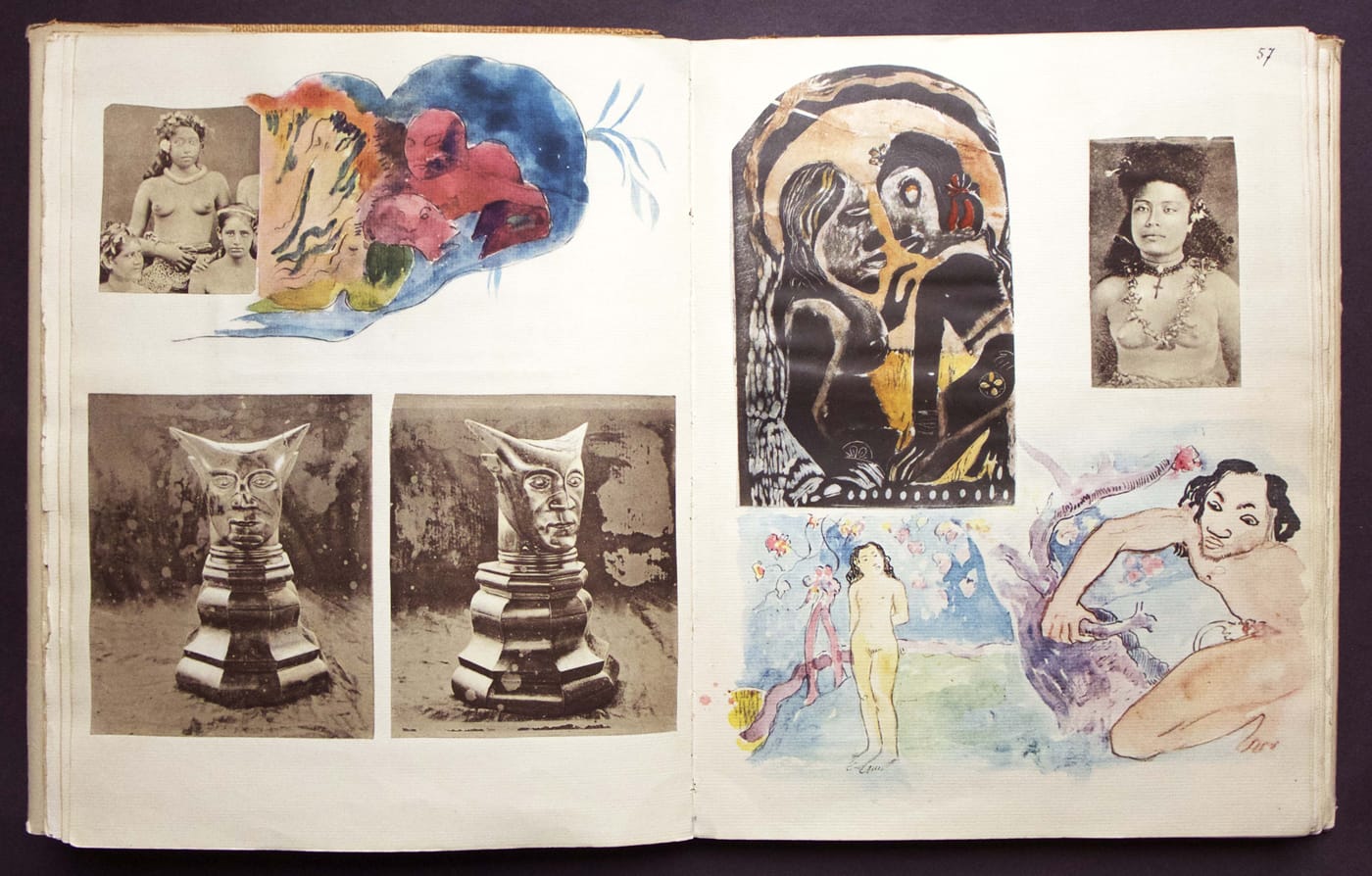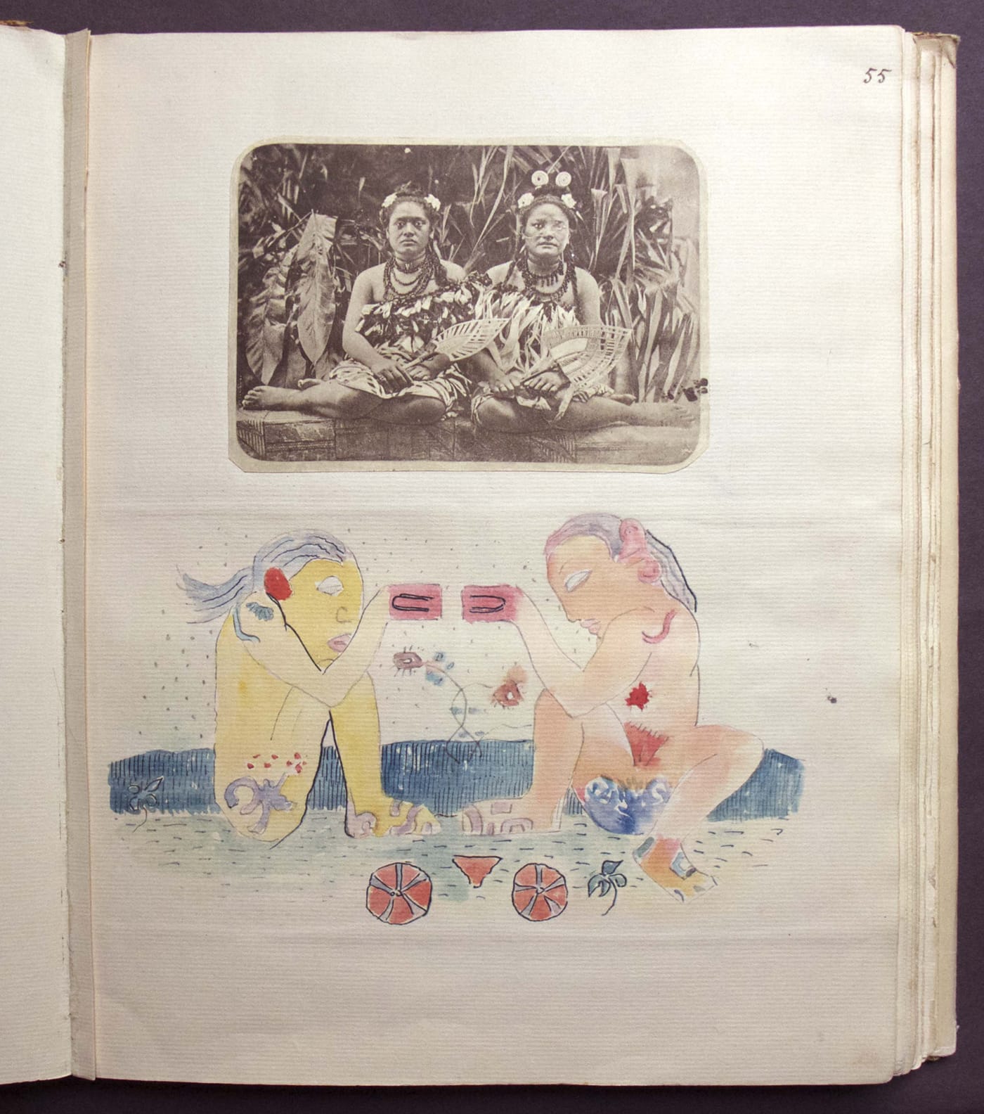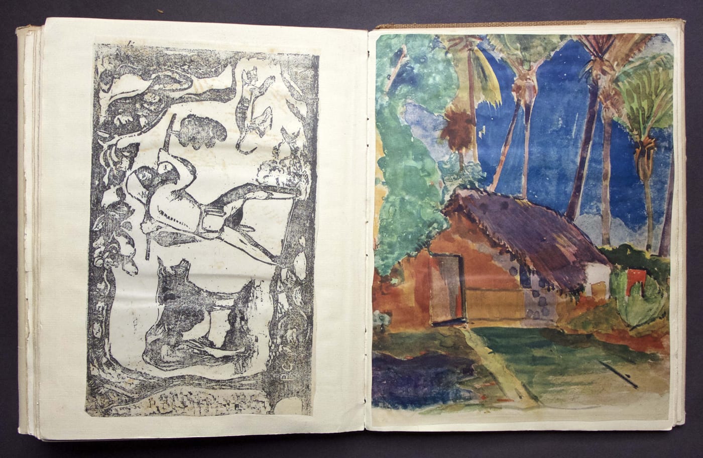 When he returned to Paris in 1893 from his first trip to Tahiti, Gauguin was itching to exhibit the paintings he produced there and would do so in November-December that year at Galerie Paul Durand-Ruel (to little financial success). To contextualize these paintings, and while in bed with a broken ankle incurred in a skirmish, he began work on an artist book called Noa Noa: which means something like “very fragrant” (in reference to the scent of Tahitian women mixed with that of their fragrant gardenia tiarés and rosewood, according to Gauguin). Throughout the text he refers to this aroma in wide-ranging poetic fashion whenever savoring his aesthetic experiences. The book, which ended up as abundantly illustrated with photographs, watercolors, clippings, drawings and woodcuts, was based on his travel journal with parts drawn from Franco-Belgian trader, explorer, diplomat and ethnographer Jacques-Antoine Moerenhout’s 1834 book Voyages aux îles du Grand Océan.