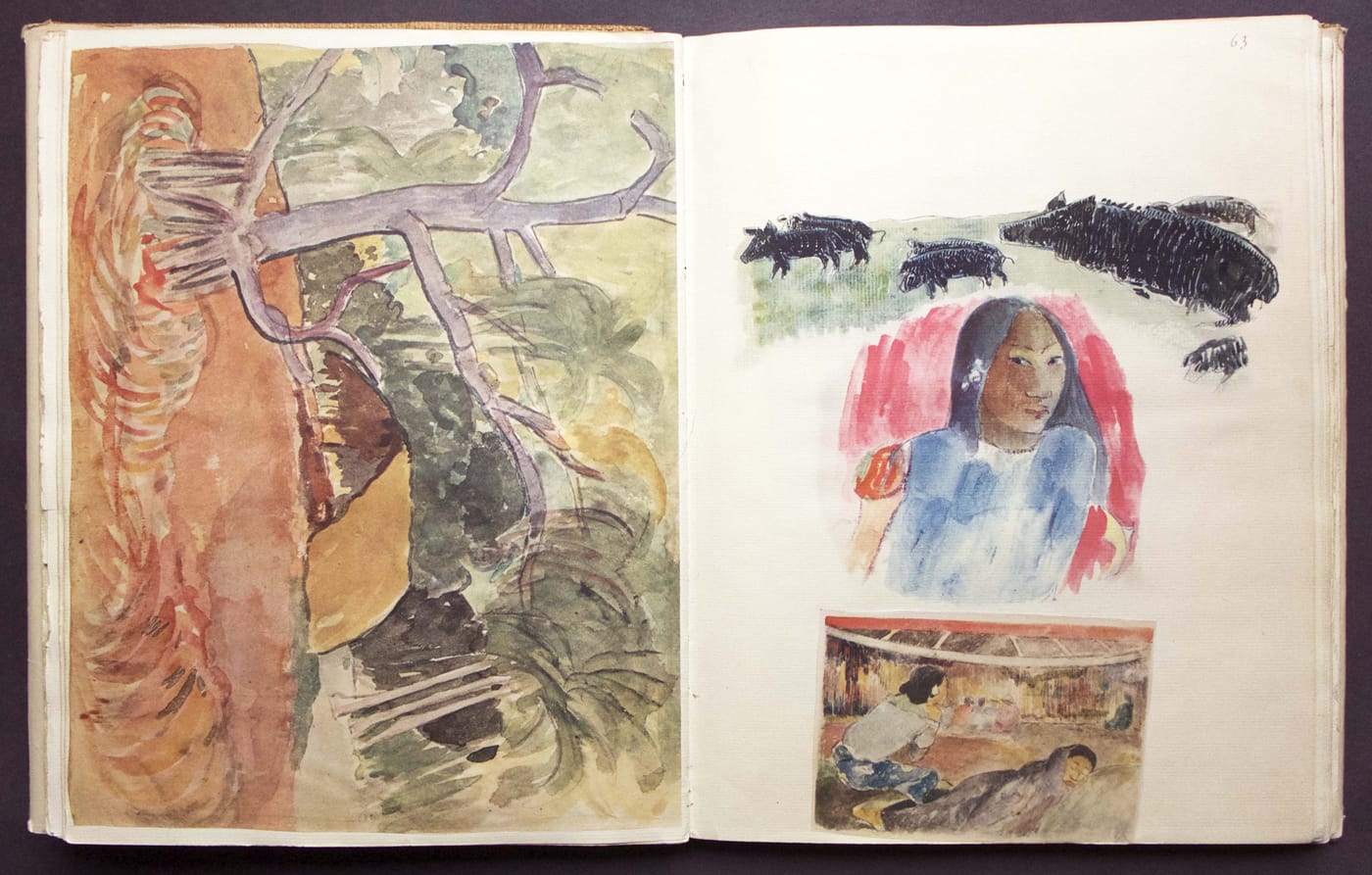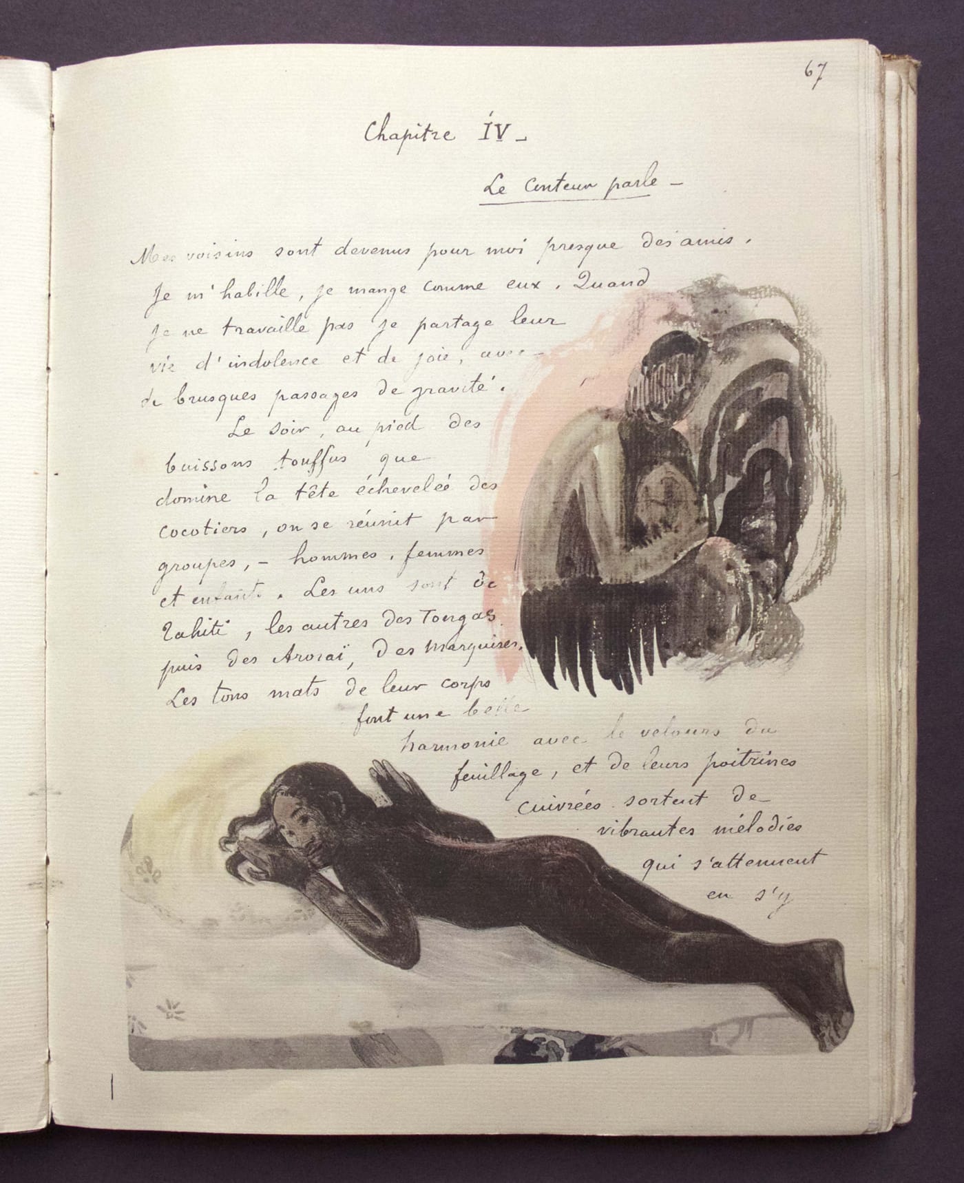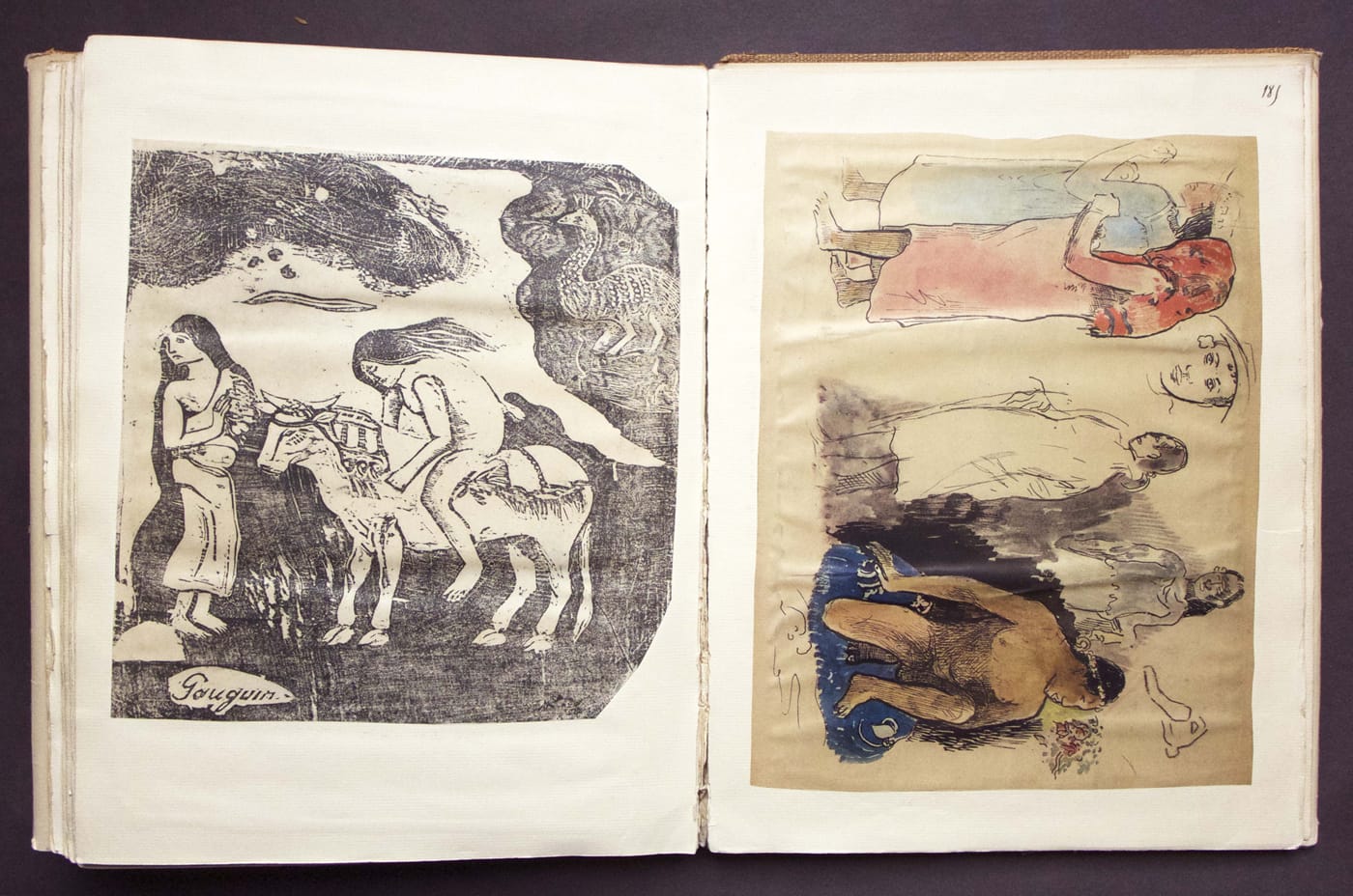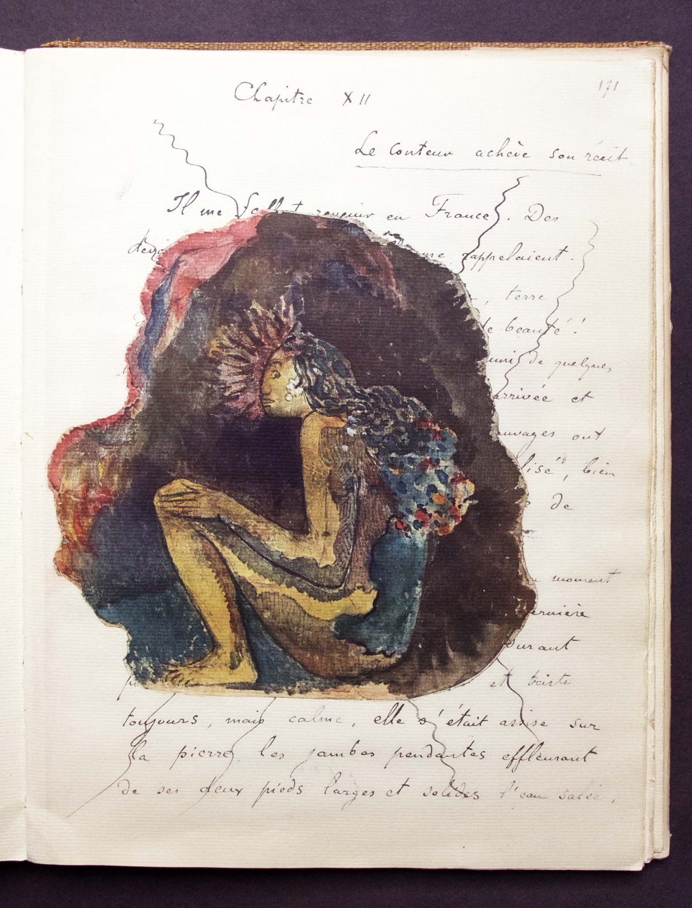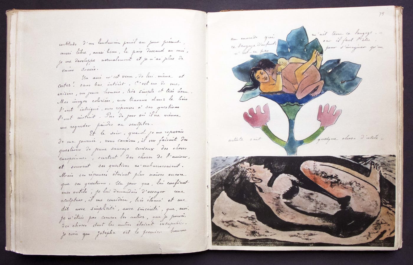 In 1903 Gauguin’s now lavishly illustrated manuscript had returned to France with the poet Victor Segalen, who had purchased it at auction following Gauguin’s death that year. Segalen gave it to Gauguin’s consigned correspondent, the painter George-Daniel de Monfreid, who in 1927 donated it to the Louvre. It is included in the Gauguin the Alchemist show, but closed, with projected photographed pages on rotating view. Based on this manuscript, in 1924, the Parisian publisher Georges Crès made an edition of Noa Noa that contained wood engravings by Monfreid, based on drawings by Gauguin.