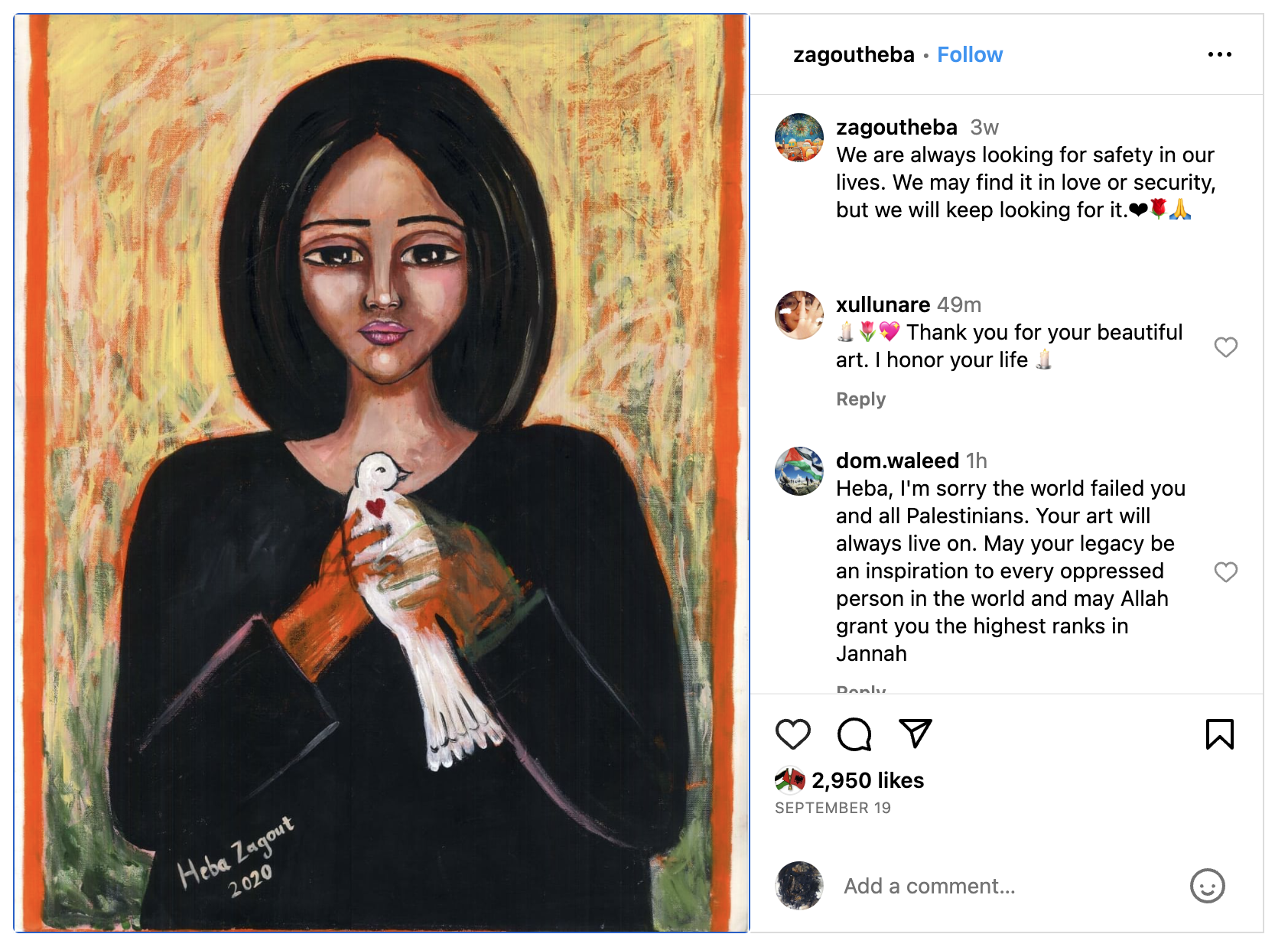 Palestinian artist Heba Zagout was killed with her two young children in an Israeli airstrike on Gaza on Friday, October 13, her sister confirmed on Facebook. The 39-year-old artist's death was also reported by the Palestinian publication Arabs48.