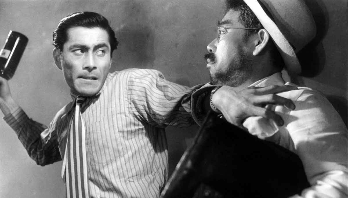 A practically pond-sized stagnating puddle of typhoid-ridden water appears frequently throughout this early Kurosawa noir, where the streets appear even more bleak. Bits of trash, broken bicycles and other detritus pock this oft bubbling body of filthy water that identifies the run-down Shitamachi neighborhood. It also marks the point of intersection between the film’s titular inspiration — a frequently intoxicated doctor (Takashi Shimura) who assists the poor and transgressive — and the increasingly ill local Yakuza boss Matsunaga (again played by Toshirô Maifune). Illness is the signature theme of Drunken Angel — real physical ailment, yes, but also societal ailment. While the Shitamachi we see in this film sometimes gives the impression of a bustling downtown with a thriving economy, far worse conditions boil beneath Yakuza swagger and tattoos — children with distended bellies, a widespread bout of TB, and individuals living in wretched conditions. Throughout Drunken Angel, a street guitarist plucks away at his instrument beneath a broken archway at night, creating a refrain for this socially-conscious noir (his song is reminiscent of a leisurely, brooding Piazzola tune). Things take an even darker turn when an old Yakuza boss is let out of jail, complicating matters for the terminally-ill Matsunaga. This Kurosawa classic screens on 35mm today at 12:30pm and 4:50pm.