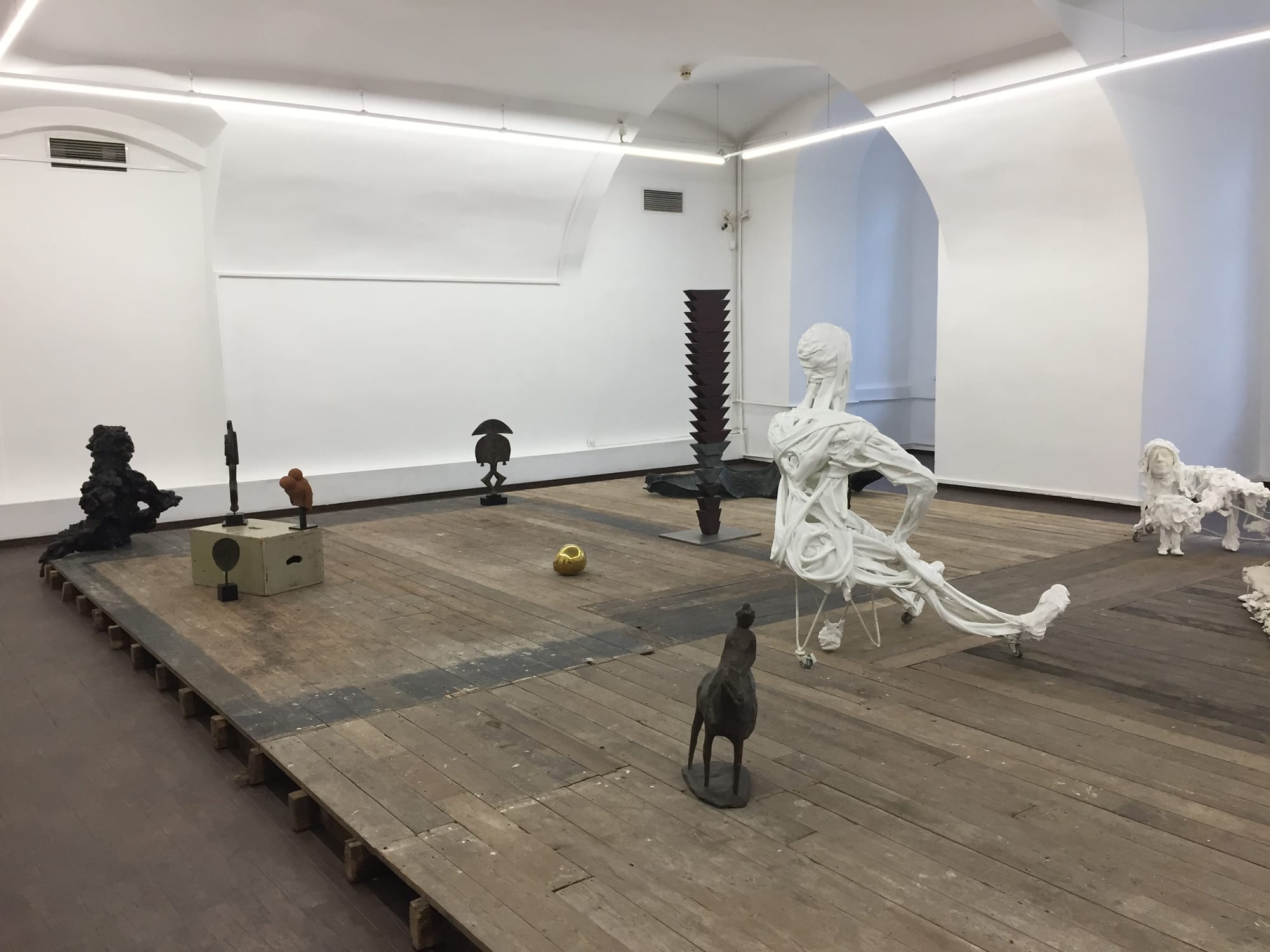 Sculptures by modernist masters such as Alberto Giacometti, Constantin Brâncuși, and Henry Moore are juxtaposed with those by contemporary artists, including Sherrie Levine and Thomas Schütte, as well as other canonical figures like Louise Bourgeois. The exhibition collects objects across three international collections: the V-A-C Foundation (the private organization founded in 2009 by tycoon and philanthropist Leonid Mikhelson), the MMOMA, and the Kadist in Paris. The installation — in which some works are at the center of the platform, distanced from the viewer, while others sit directly on it without plinths — makes it difficult to appreciate the individual pieces. As a result, viewers are pushed to consider the piece as a whole environment.