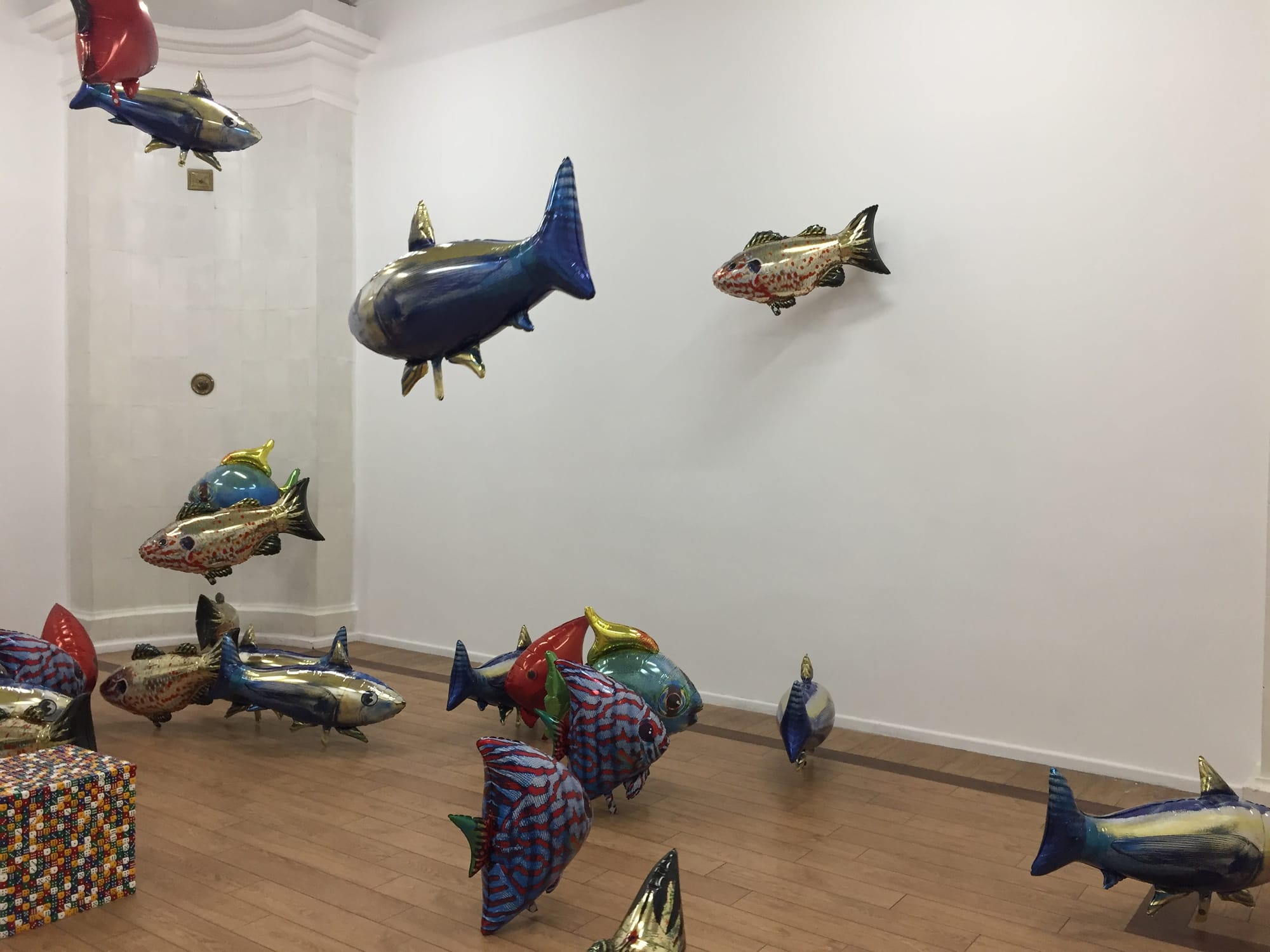 The gallery’s architecture was ideal for Philippe Parreno’s “My Room Is Another Fish Bowl” (2016), comprising colorful fish-shaped Mylar balloons floating at various heights, delicately moving through the space. The delightfully gentle movements of Parreno’s balloons were as hypnotic and pleasurable as the experience of watching fish swimming in a tank. A similar sense of theatricality was found in Lucy McKenzie’s “Lina Mouton” (2016), an installation featuring Art Deco-style furniture made from stretched canvases with trompe-l’oeil paintings and assembled from cut-out patterns.