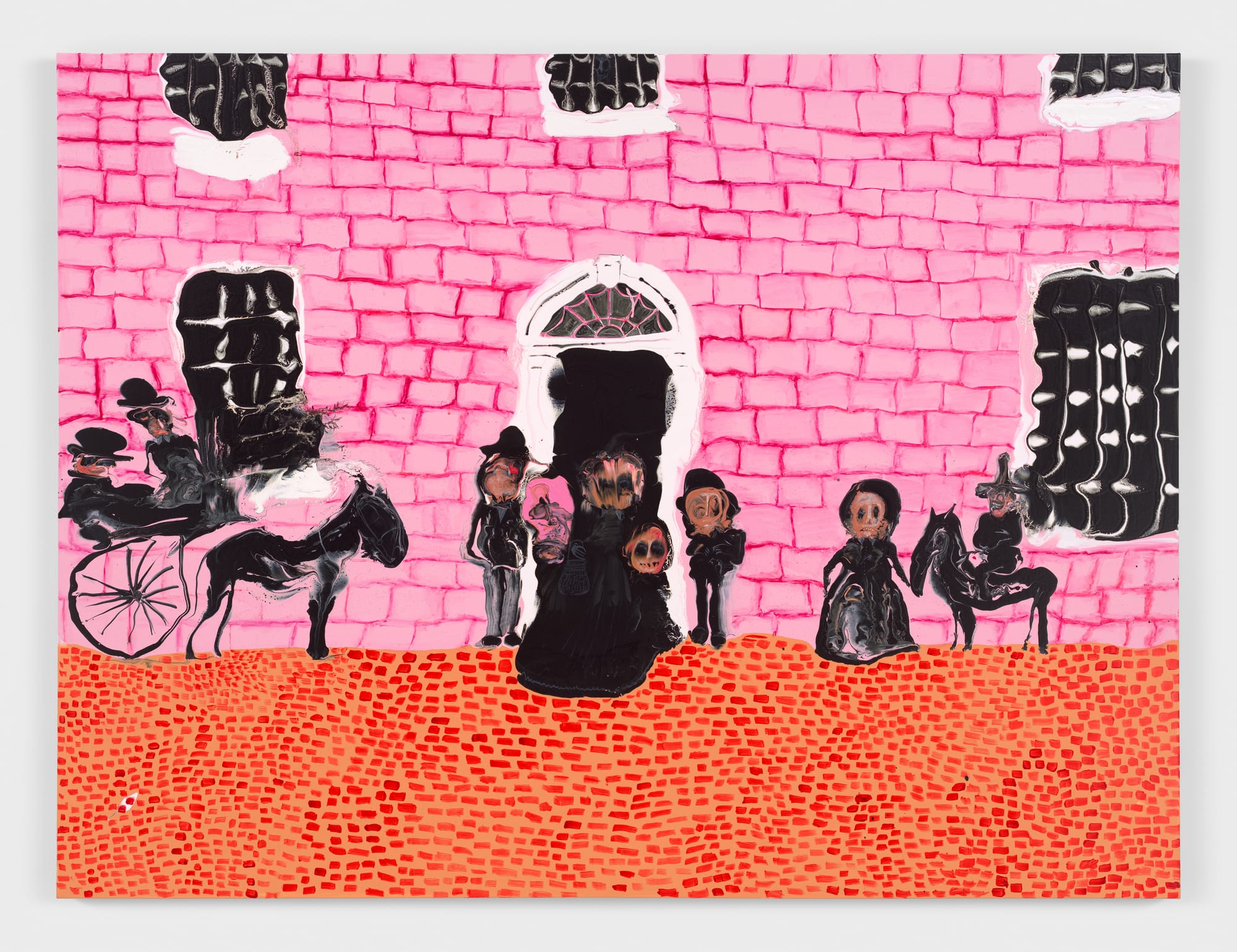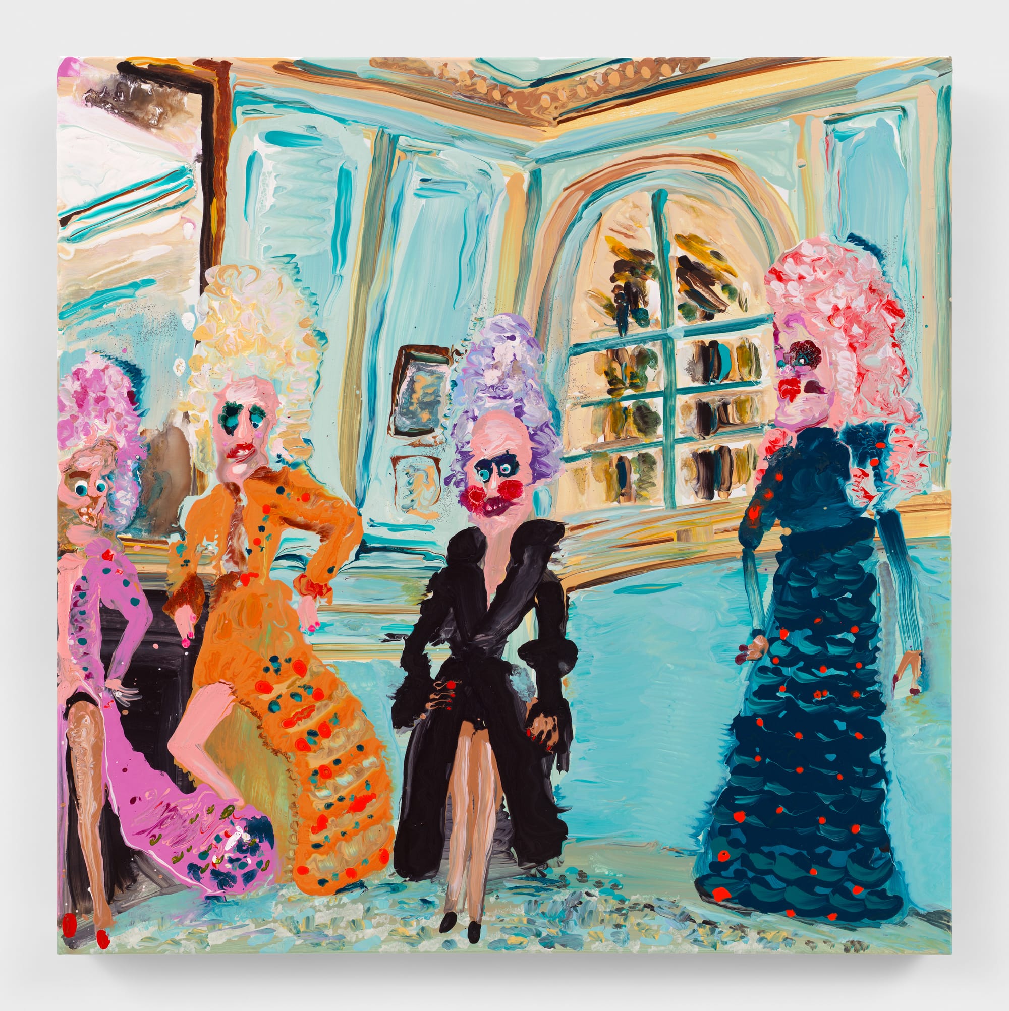 On the surface, the artist’s irreverence seems charmingly innocuous. She satirizes the pomp and circumstance of Britain's and Ireland’s upper classes in bright shades of pink and yellow, hinting at superficial sweetness in the gaudy dress and decor of her subjects. Women wear colorful wigs and bear clownish grins made with thick globs of white, red, and black acrylics. The lizard-like features of the ladies in “Fashion shoot” (2021), for example, could put Ralph Steadman to shame. Figgis accomplishes this by applying a funeral’s amount of blush and eyeshadow to each visage.