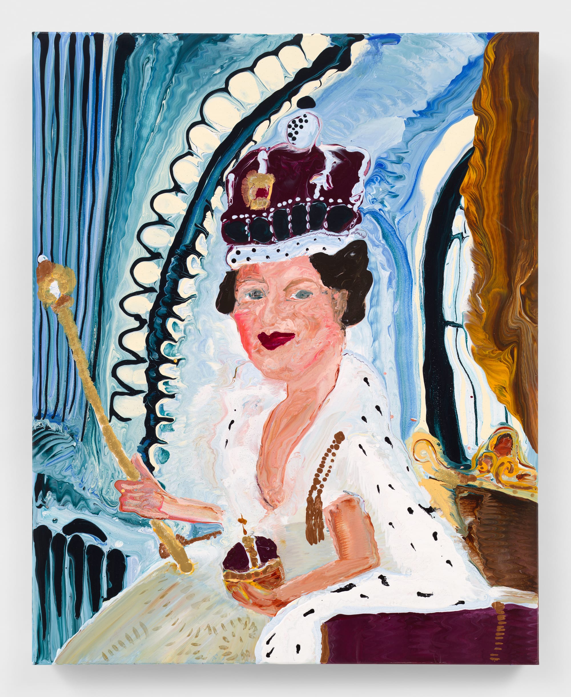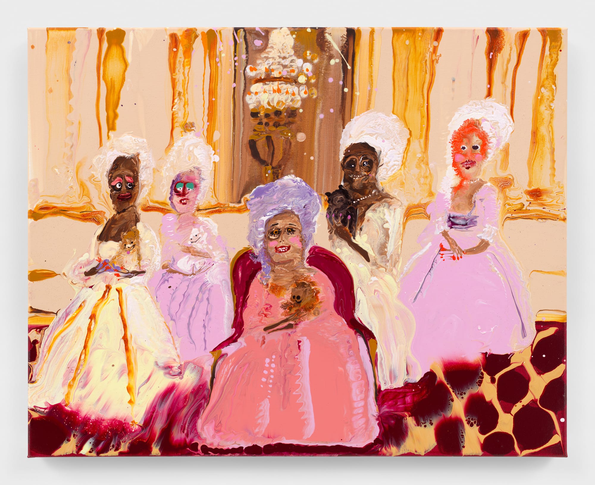 Figgis paints ghoulish portraits of aristocratic families, portraying high society as a spectacle of humor and horror. Her latest exhibition, at Almine Rech’s Upper East Side outpost, finds her continuing with themes of decayed splendor. Immortal Reflection features her large-scale drip paintings, along with more detailed figurative works that lean closer to realism. The two painting styles on display here seem to contrast, yet they retain the gloomy playfulness that her audience has come to expect. The gallery has marketed this show as “subversive” and “resistant to the structures of the establishment,” so I felt compelled to exhume the particular critique Figgis is offering viewers this time around.