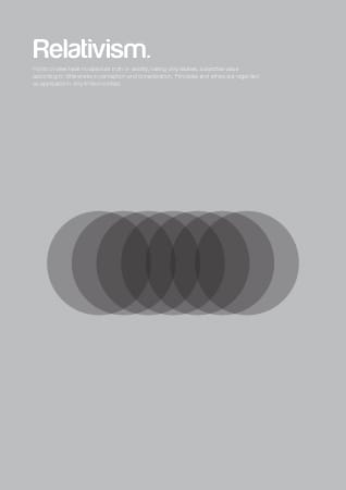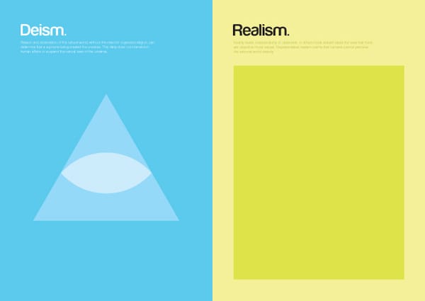 So thank goodness for a designer like Genis Carreras, whose attempt to distill complex philosophical topics into clean, minimal posters is welcome. Determinism, for instance, appears as a set of dominos kickstarted by a single ball. Free will envisions a world of randomly-arranged triangles and diamonds. Some are not so clear at first glance — existentialism appears as a series of intersecting ovals, forming a butterfly-like shape — and some are downright provocative, like an upside down cross for atheism.