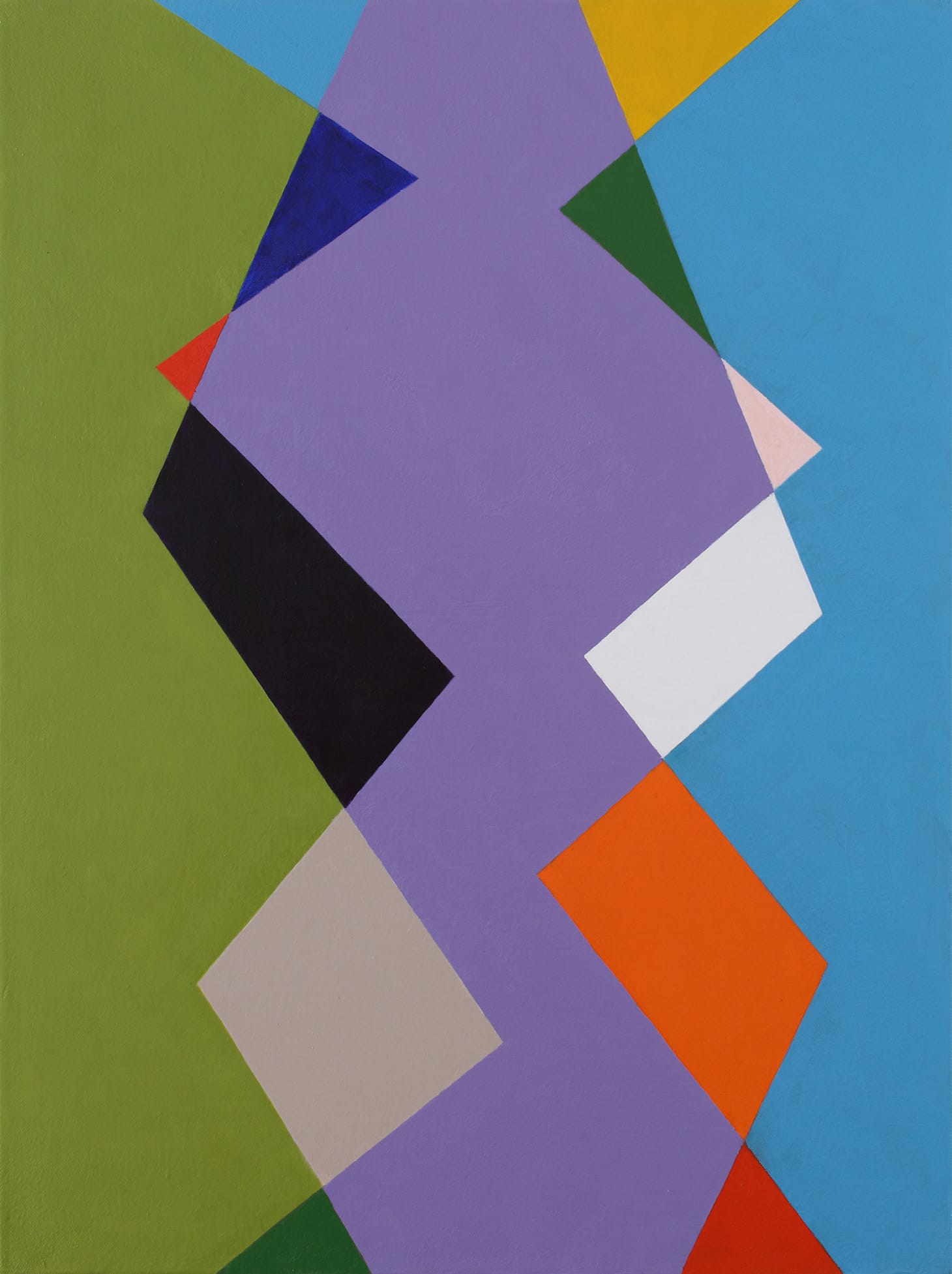 In these regards, Westfall rejects both all-over painting and structural patterning, which he often relied upon in earlier work. In fact, I would suggest that he has introduced the possibility of improvisation into his planar geometric work, so that the color-to-color and form-to-form relationships do not depend upon a containing structure. That this change took place in the paintings between 2020 and 2021 — while we were living with the COVID-19 pandemic and in relative isolation — does not seem purely coincidental.