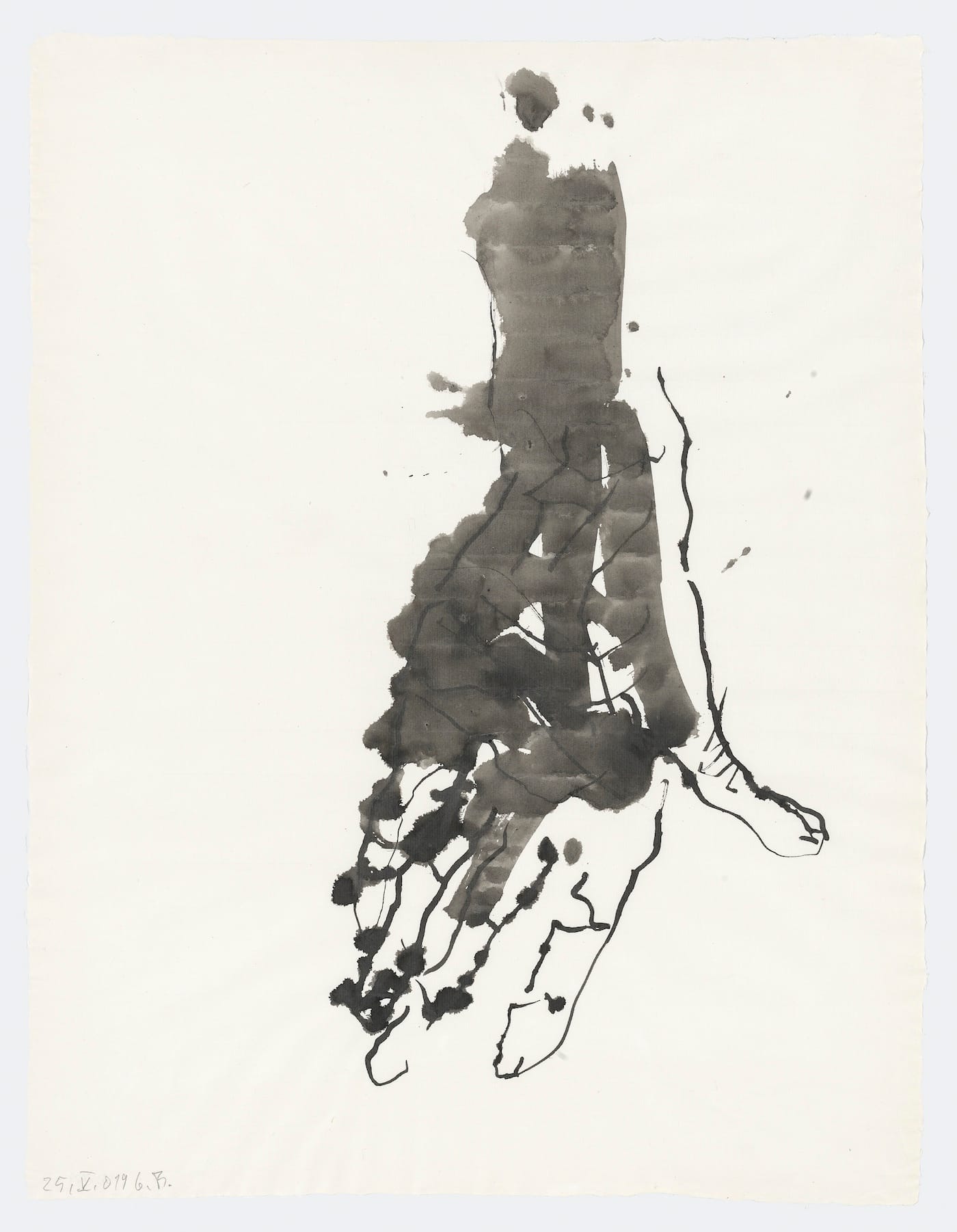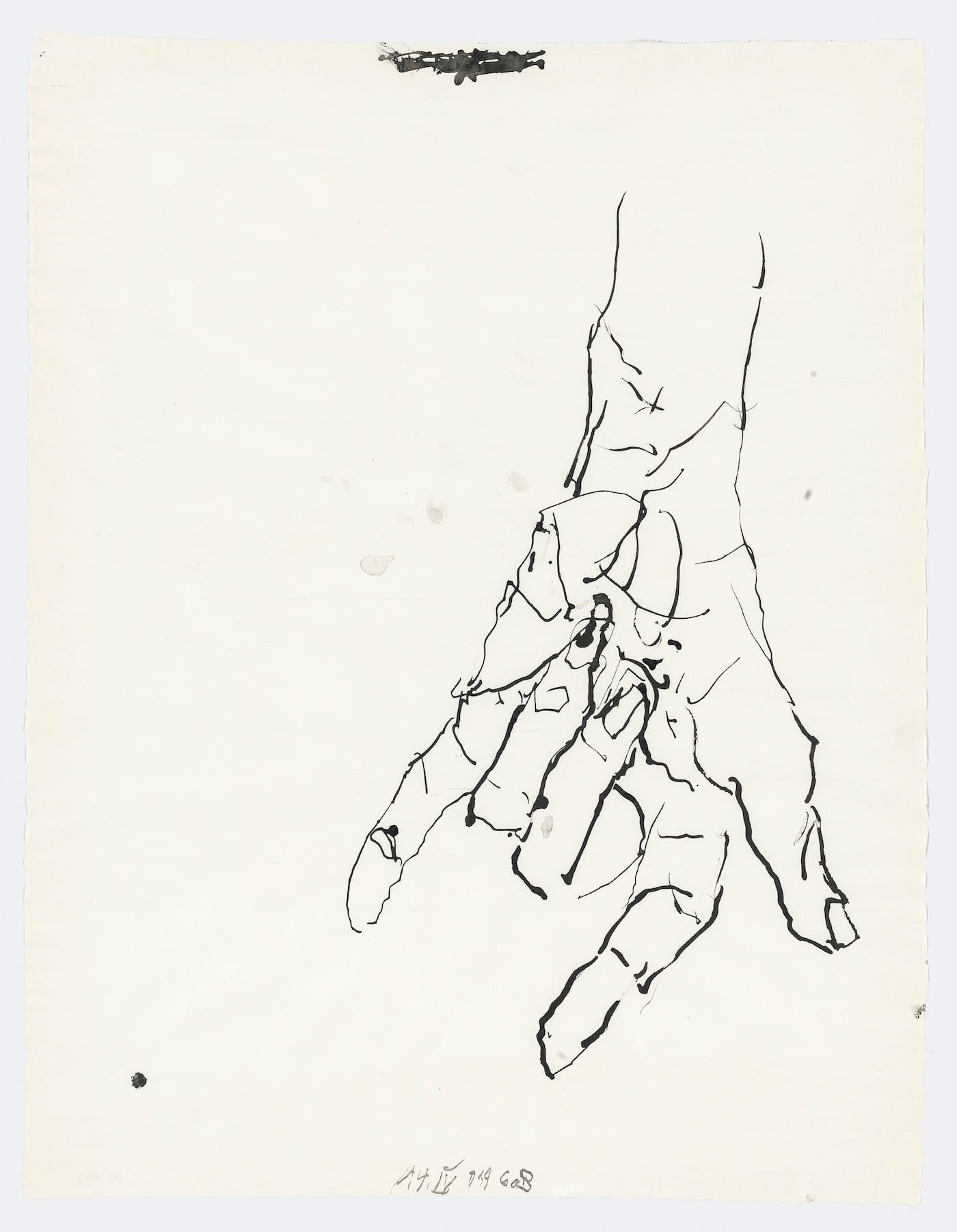 Baselitz’s hands dangle down, wrist top, fingers bottom. There is undeniably a mood of helplessness about them, a wish to be pitied, evident in their age and their isolation, framed within this black void. That does not mean that they are inert, not exactly, not all of them. A single finger folds back on itself, flexing its meager evidence of life … We see much more evidence of hand-life, finger-life, in some of the working drawings in the tiny gallery tucked in beside the lift downstairs.