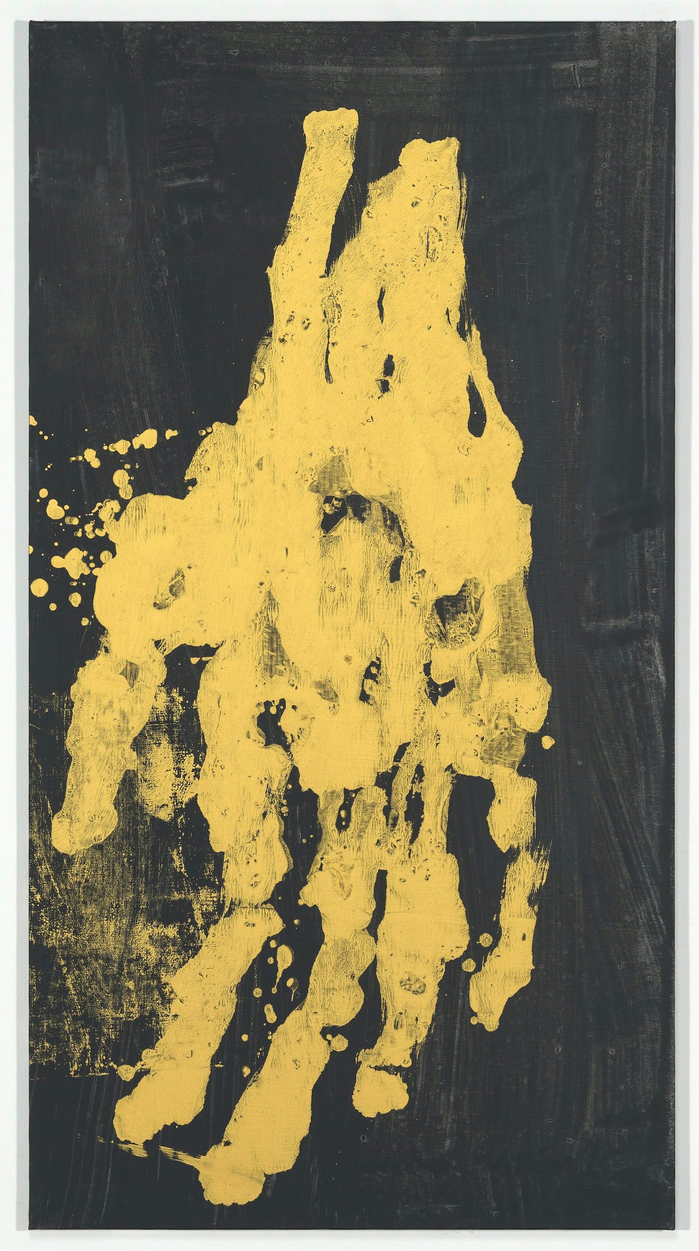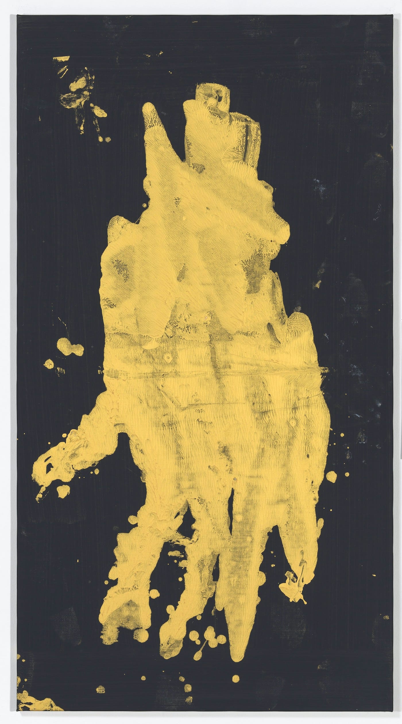 These new hands are giant hands, almost alarmingly so, 17 of them processing around the walls of the large downstairs gallery, many more upstairs. They are long and relatively narrow. Each work is a combination of monoprint and painting. Each hand is gold against a black ground. The gold is smothery. The hands dangle in space, into a black void, like Géricault’s hospital specimens. They have all the withered, shriveled, poignant, alarming fragility of very old hands, knuckly, bony, loosening and falling away into their constituent parts. The hands seem to be dribbling in the direction of their own disintegration, disappearing even as we give them our attention… They are dream visions of hands, spectral, a little like frozen water, seeming to lengthen a little as they hang, caught between gesture and complete inertia.