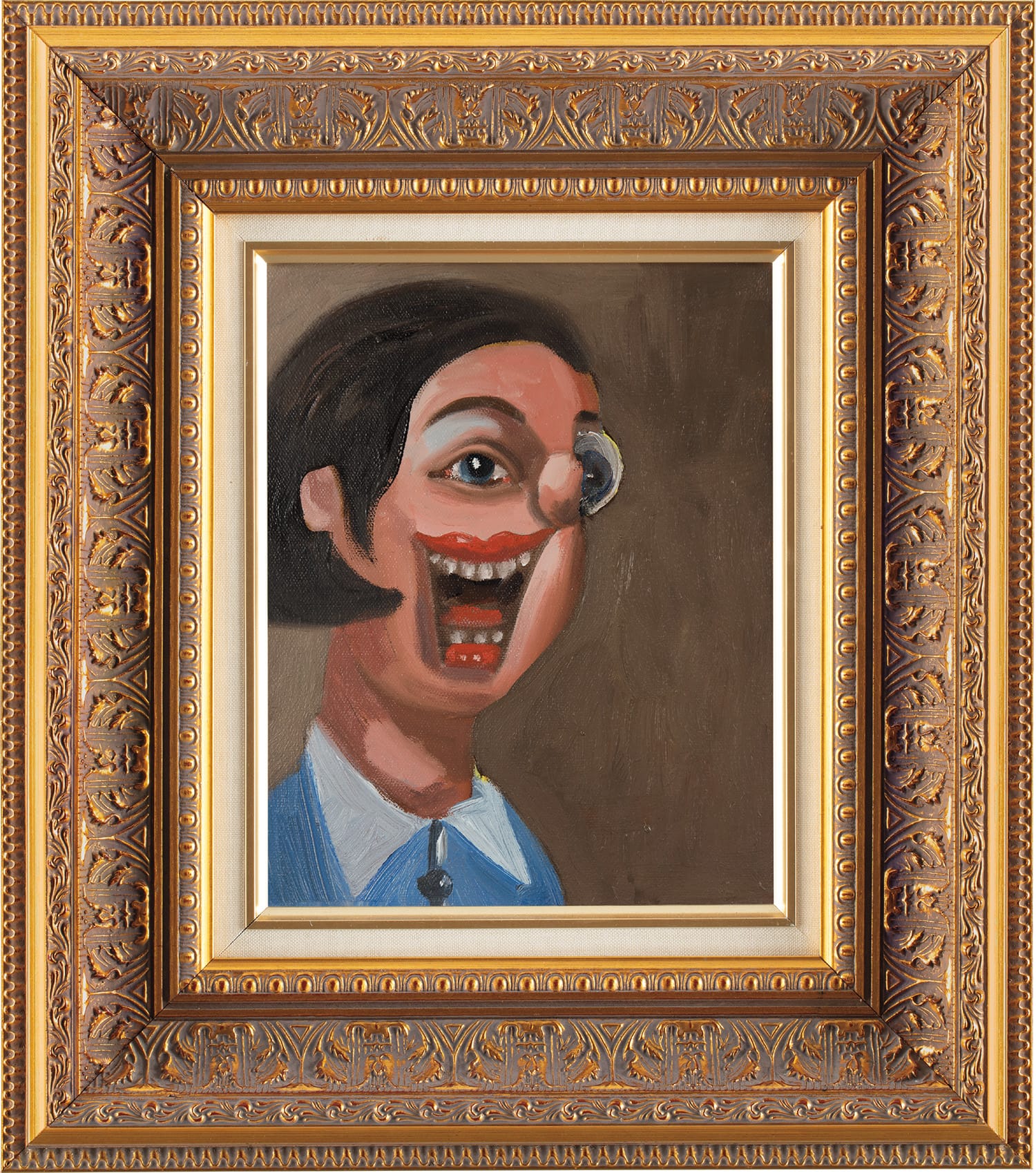 The modestly scaled “Smiling Girl with Lilac Shirt,” which comes in an ornate artist’s frame, depicts a smiling young woman with a bob haircut, facing the viewer from the painting’s left side at an angle. She has one Cyclopean eye that stares straight ahead, placed directly above a large, open, red-lipped mouth that is also painted frontally. Her lower teeth seem rather small and spaced slightly apart, suggesting that she is in need of cosmetic dentistry.