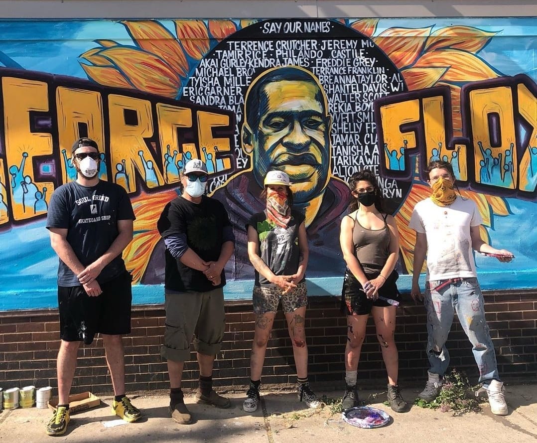 The mural, located on the corner of 38th Street and Chicago Avenue South in Minneapolis, is the work of artists Xena Goldman, Cadex Herrera, and Greta McLain. The group started working on the mural on Thursday morning and finished it within 12 hours with the help of artists Niko Alexander and Pablo Hernandez.