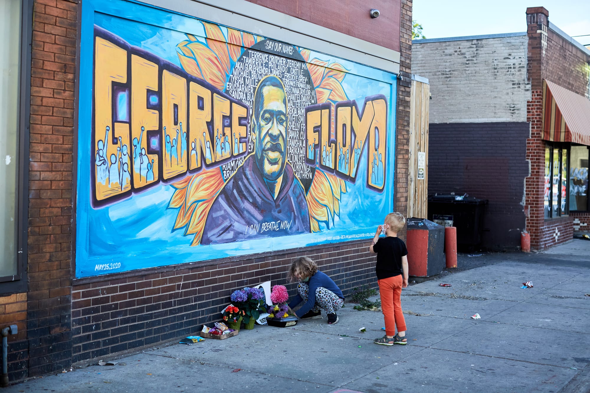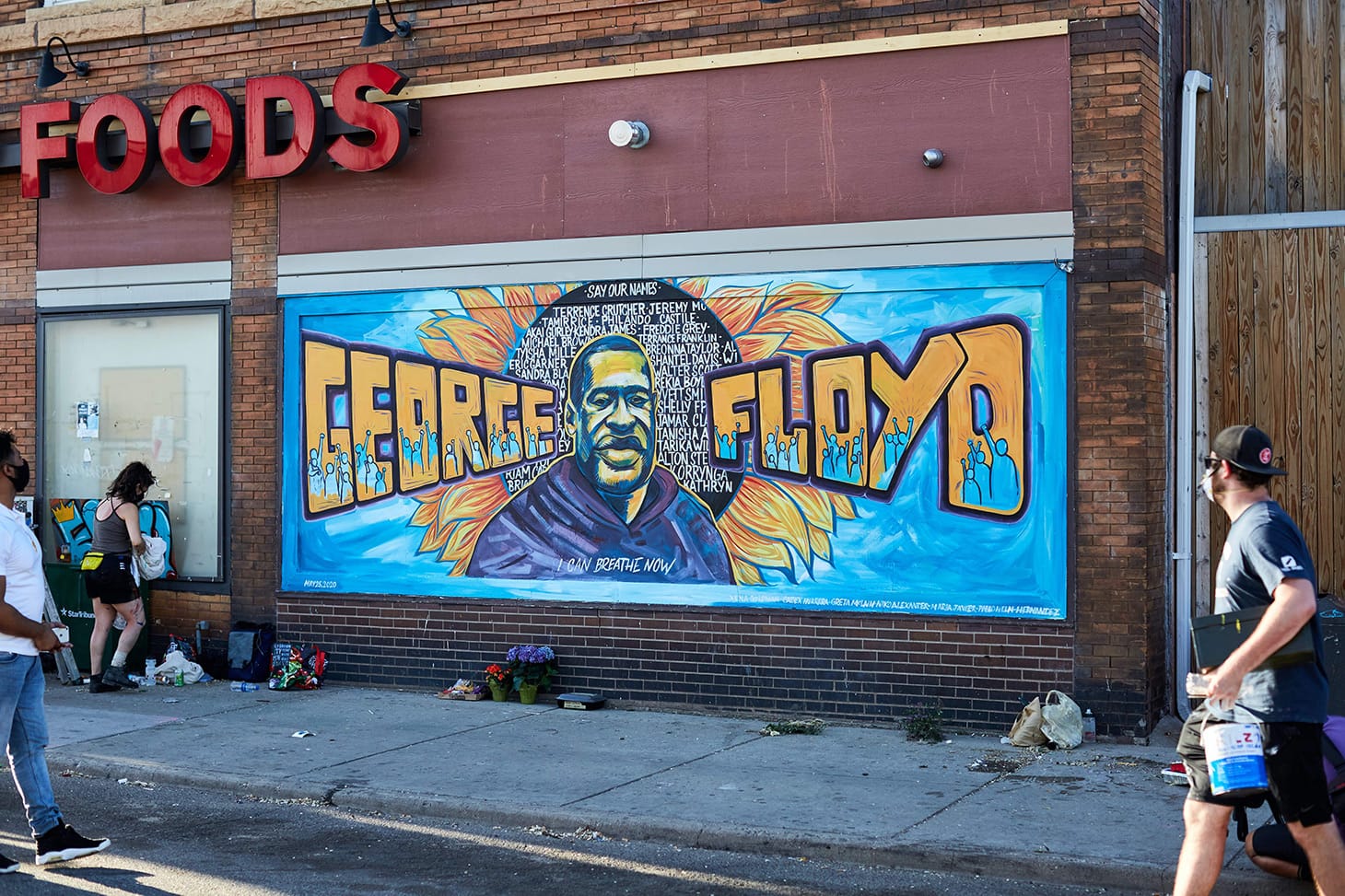 A portrait of Floyd centers the 20-feet-wide and 6.5-feet-high mural. He is flanked by figures of protesters, painted inside the letters of his name. In the background, Herrera painted a sunflower decorated with the names of other Black Americans who were killed by police.