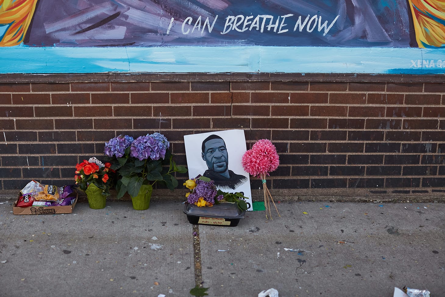 At the bottom of the mural, a member of the community has added the phrase “I can breathe now” on Floyd’s chest.