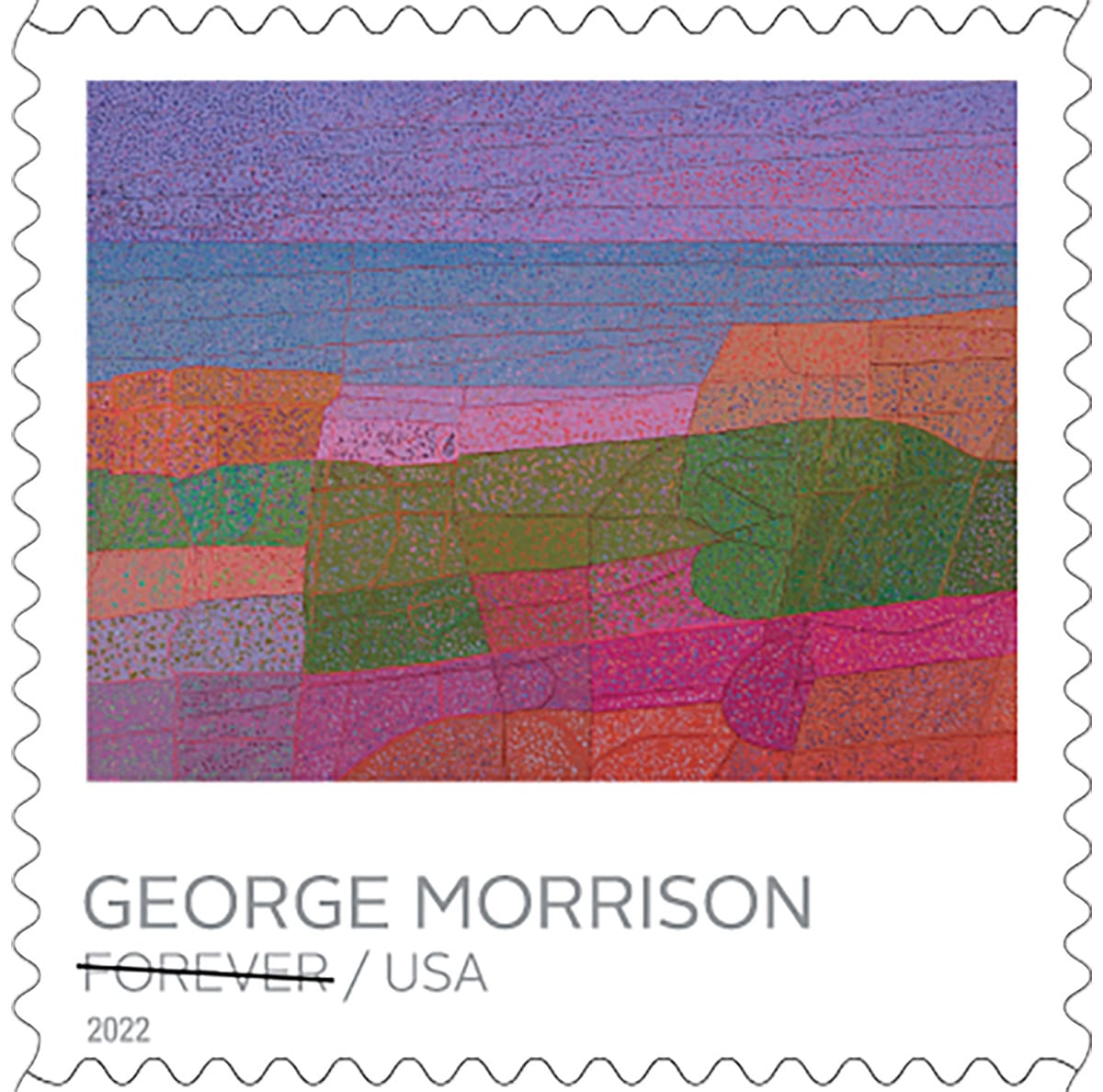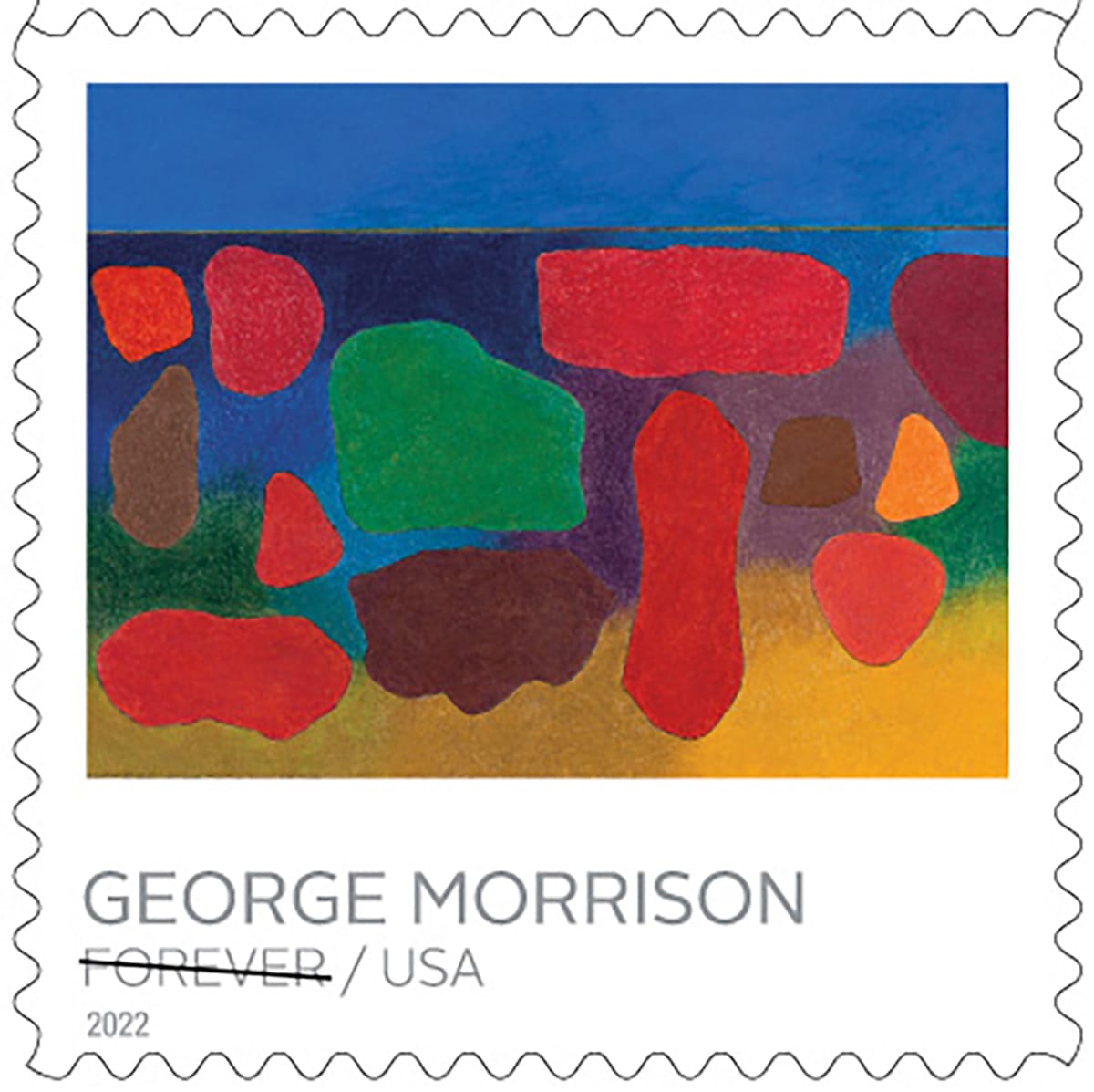 This spring, the US Postal Service will begin circulating five new stamps featuring the landscape paintings of George Morrison — a 20th-century Minnesotan Ojibwe artist whose work has been associated with Abstract Expressionism, Regionalism, and Surrealism, but whose oeuvre cannot be neatly summed up by any one of those categories. His work features heavily in Twin Cities museums, but those in the New York area may be pleased to know his 1956 painting “The Antagonist” current hangs in the permanent collection exhibition at the Whitney Museum of American Art; still, his name has remained less prevalent outside Minnesota. Despite this, Morrison was by no means an artist circumscribed by where he was from or the identity others expected him to perform, and his recognition by the USPS might begin to broaden his legacy.