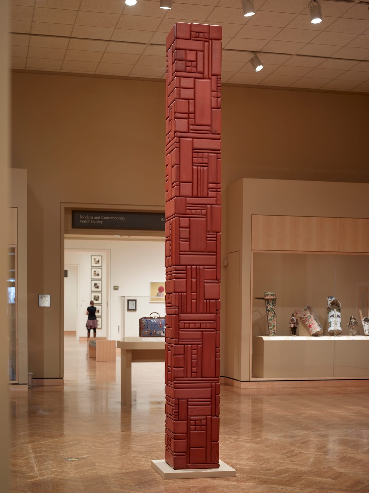 Morrison’s totem poles quote those of the Northwest Coast, and several of them are red, which Maurer interpreted as “an allusion to the sacred earth paint and a sign of consecration emphasizing the traditional strengths of his ancestral heritage.” “Red Totem I” (1977) is a prime example, its cubic and rectangular patterns on each vertical face echoing Mondrian’s geometric layouts while retaining a tactility unique to Morrison.