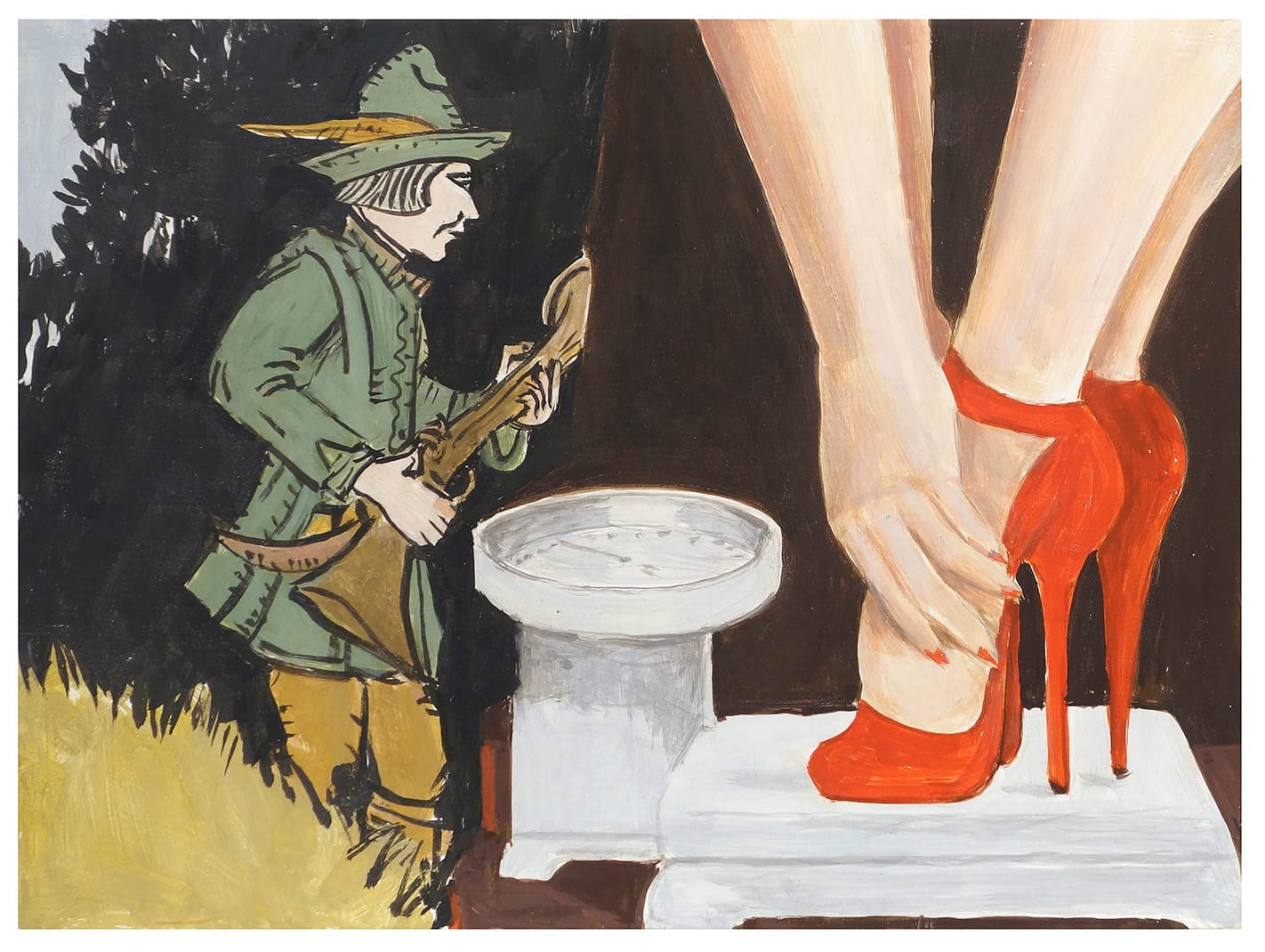 Done between 2000 and 2006, the paintings after collages were done in egg tempera on panel. They constitute a distinct body of work within Schneeman’s oeuvre and should be better known. They are made up of fragments: an image of a woman’s hands gripping her insteps, her feet shod in red high heels. From the title, “Hunting/A Weight” (2001), she appears to be standing on an old-fashioned bathroom scale, while “Hunting” refers to a miniature pilgrim carrying a blunderbuss on the left. In this and other paintings, there is a clear invitation to supply a narrative. Their juxtapositions never feel arbitrary, and they cannot be quickly unpacked. This where they get their staying power, and yet there is something mysterious and even sweet about them. Perhaps a show solely devoted to these works, which are like no one else’s, is what should happen next.