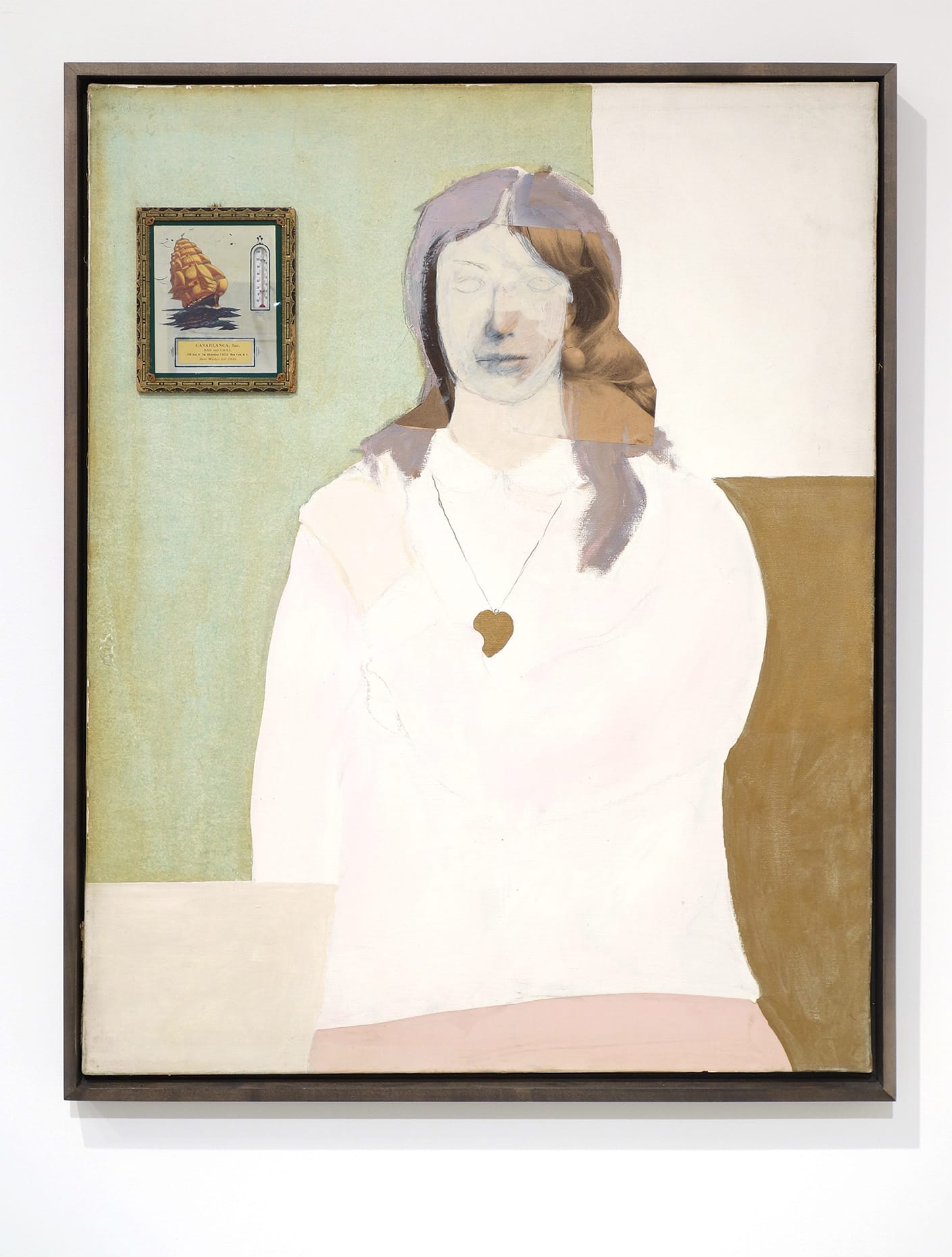 There is a portrait in acrylic and collage called “Untitled (The Locket)” (1967), in which Schneeman depicted his wife Katie the year after they moved to New York and were living in a small apartment on East 7th Street near Tompkins Square Park. According to Katie, he bought the locket in a junk shop across the street for her as a Christmas present. It cost 35 cents. Thinly painted in muted ocher and surrounded by white, reflecting Schneeman’s love of fresco, making the locket the composition’s focus. In the upper left corner Schneeman has affixed a framed holiday greeting from the Casablanca Bar in year 1946, which includes a real thermometer. This too likely came from the junk shop and probably cost less than 35 cents. This is Schneeman’s aesthetic: use whatever is lying around the house. In a country devoted to materialism, Schneeman’s gesture strikes me as radical and rebellious without announcing that fact.