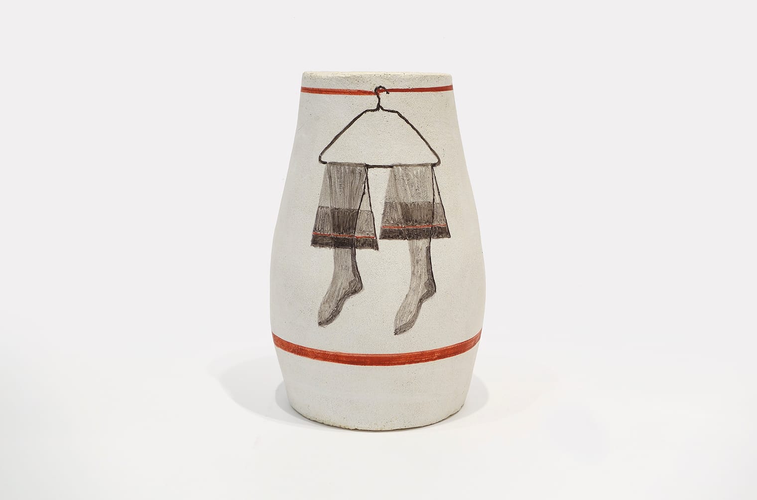 The selection of ceramics, which Schneeman taught himself to slip cast, includes three in brown and black dating from 1980-81. These are incised with portraits, two of which are identified as “Rene (Ricard)” and “Susan Rothenberg,” while the third is untitled. On another ceramic, “Untitled (Stocking Vase)” (1980), which is primarily white with an orange stripe at the top and near the bottom, the artist has depicted a pair of stockings draped over a coat hanger — a meeting of domesticity and the erotic.