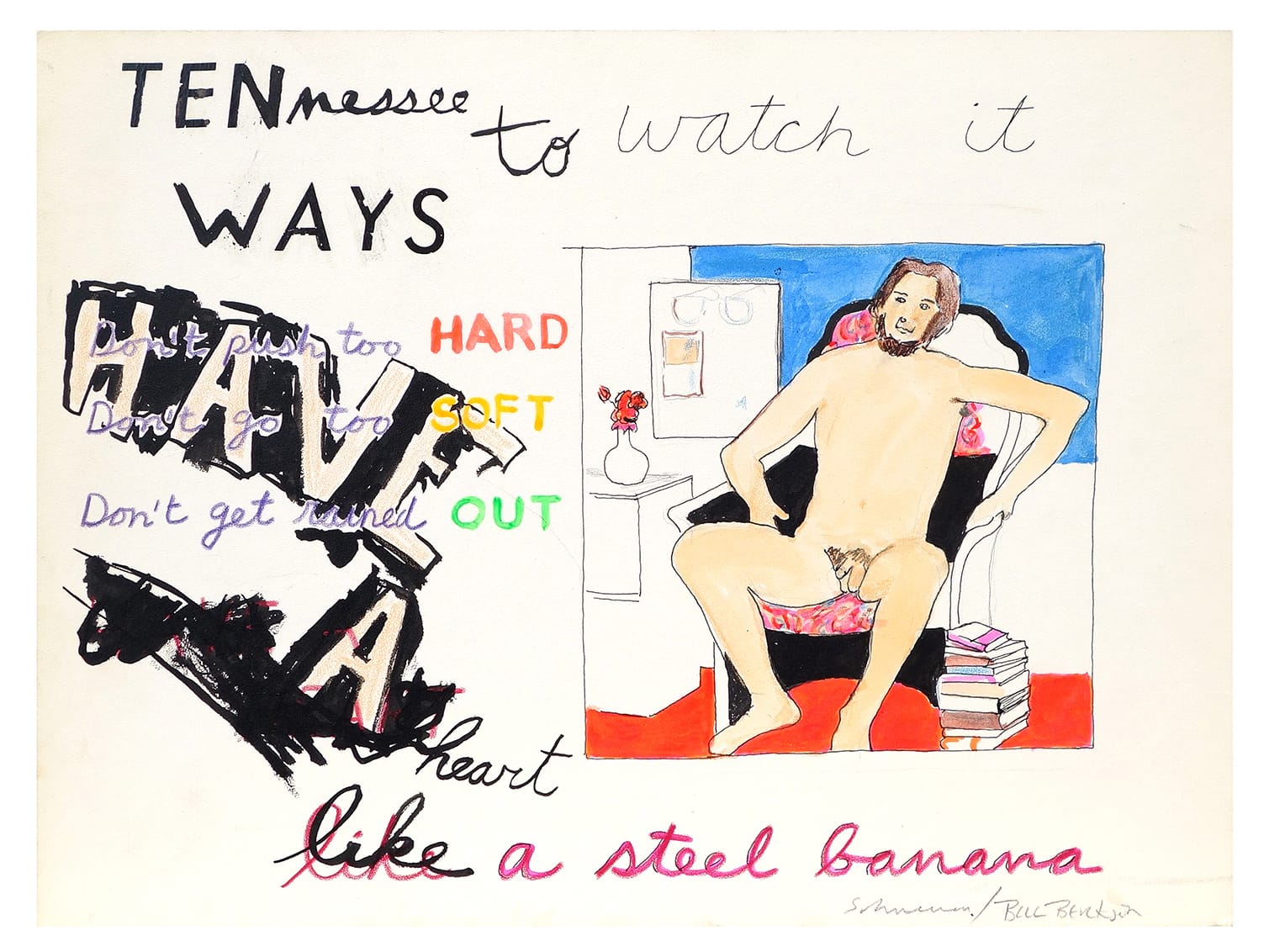 There is a lot in this small exhibition to recommend. The collages Schneeman did with Berkson are diaristic accounts of whatever they were watching on television (baseball or perhaps a movie) or talking about: the title of the great noir film Out of the Past (1947), starring Robert Mitchum, Kirk Douglas, and Jane Greer, directed by Jacques Tourneur, is written on one collage. The film actress Ann Dvorak, who retired in 1951, is another name that is likely unknown to many, but it has also found its way onto another work. There is a richness of pop culture associations mingled with crude phrases in the mixed media work “Ten ways to watch it” which also includes a seated male nude and the memorable phrase, “Have a heart like a steel banana.” The writing and images (drawn, painted, collaged) are slight and yet powerful: they have a gritty urban feel to them.