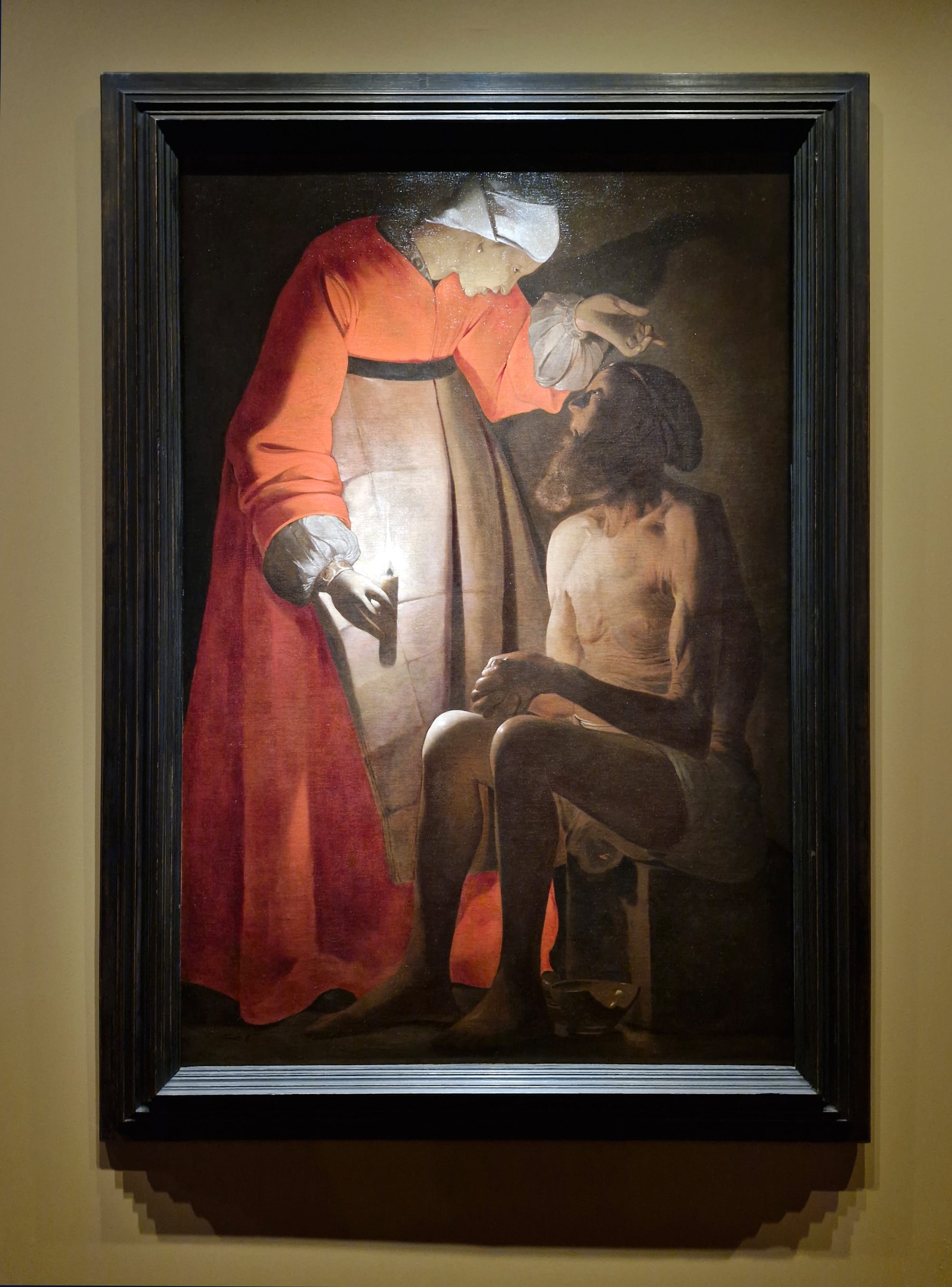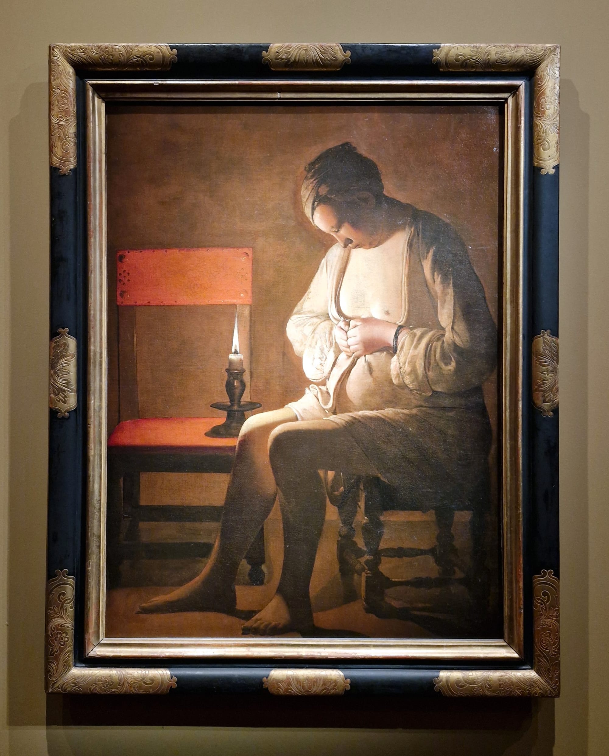 The exhibition's focus is on how de La Tour incorporated the trend of Caravaggesque chiaroscuro that swept Europe into his relatively austere genre compositions, lending them a uniquely intimate and spiritual quality. So many tonally dark scenes of isolated figures doing things far from grandiose — see titles like “A Woman Catching a Flea” (c. 1632–25) or “Boy Blowing on a Firebrand” (1646) — would have benefited from the hushed reverence of the isolated, near-total darkness in which the Louvre displayed Marat in its David show a few blocks away. Persistent middling light and crammed displays not only inevitably result in dilution of effect, but also draw attention to the inconsistent condition of the pieces, making visible the irregular weave and other flaws. This is not to criticize curators Gail Feigenbaum and Pierre Curie — spatial or budgetary constraints are out of their control. The setting only somewhat detracts from the ambition of the show, notably the sheer geographical breadth from which these loans have come: not only regional French collections but also those ranging from Tokyo to Washington. The assembly itself is remarkable.