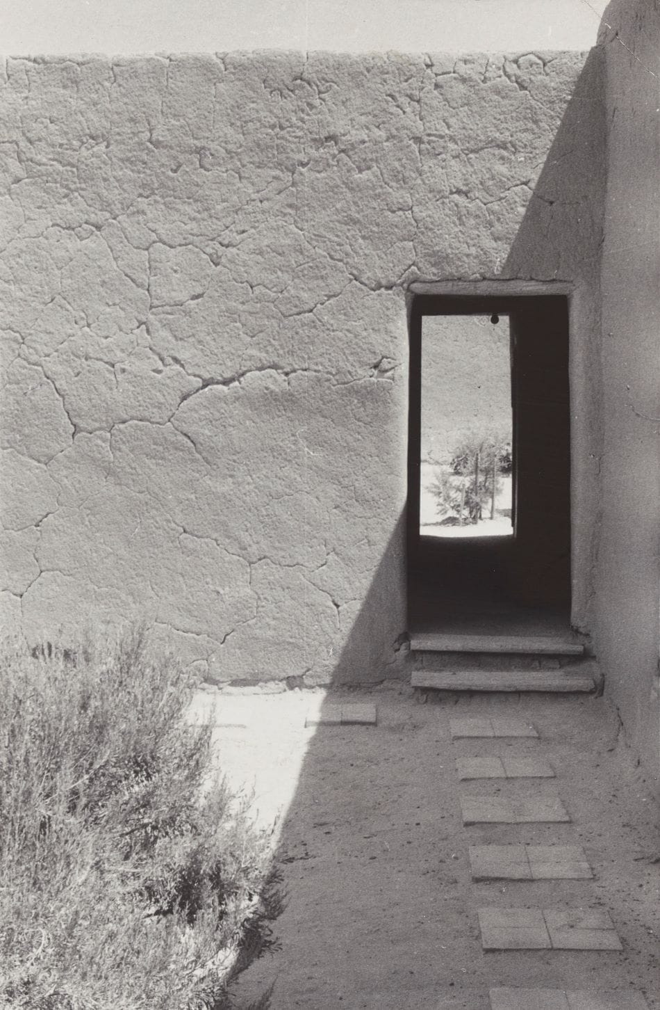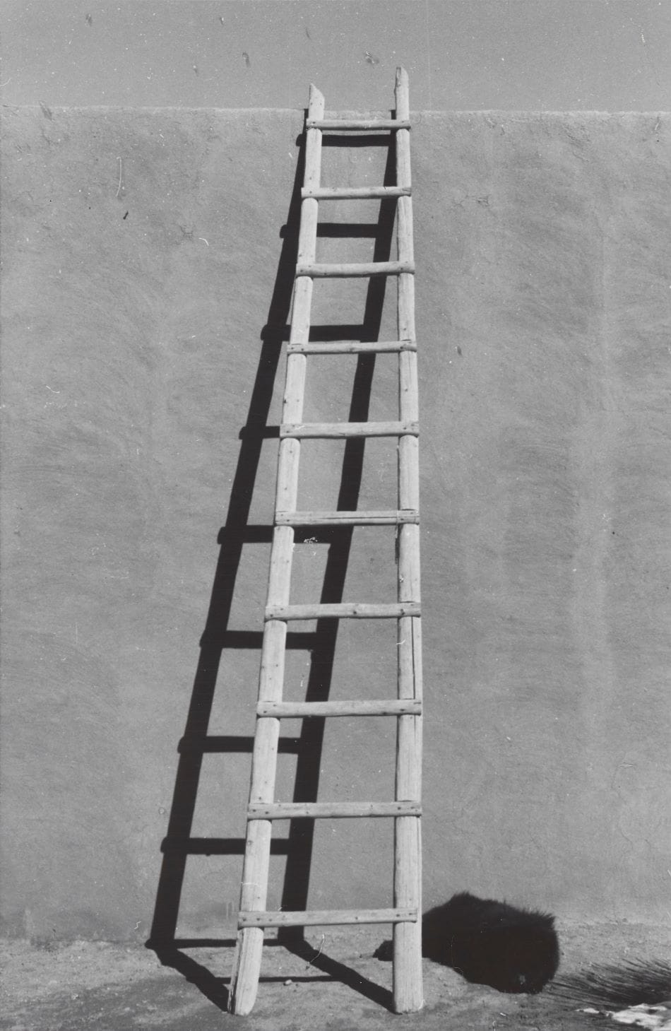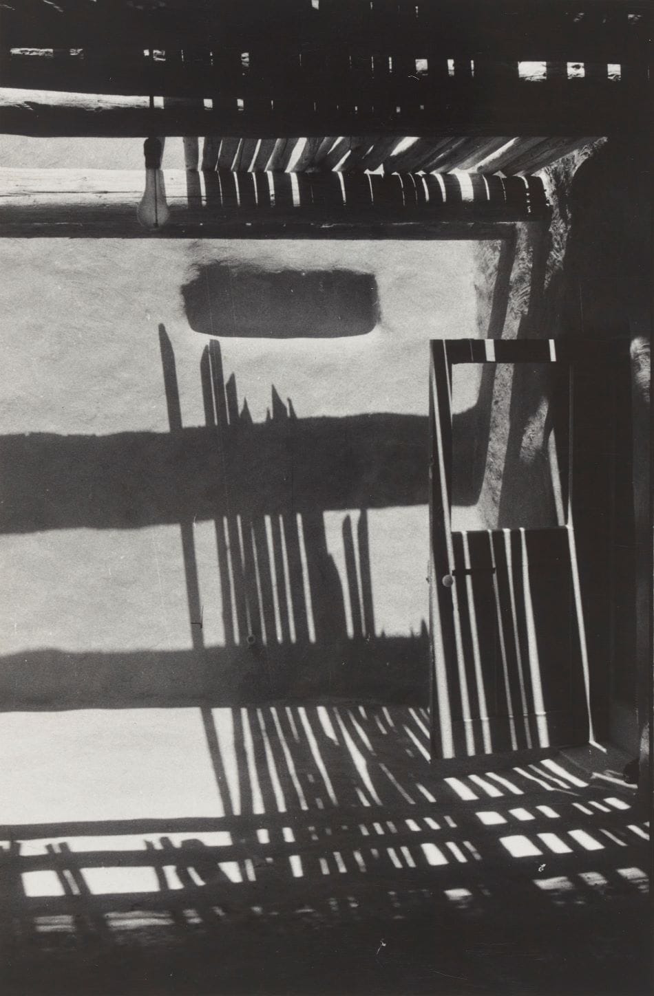 The second theme, Light, features O’Keeffe’s photographs of her home in Abiquiú, New Mexico, such as “North Patio Corridor” (1956–57), “Ladder against Studio Wall with White Bowl” (1959–60), and “Salita Door, Patio” (1956–57). In these images the salita door becomes a black hole, and a bleached ladder leaning against an adobe wall casts a singular, black shadow, seemingly as sturdy as the ladder itself. Here we see the painting “In the Patio VIII” (1950) in which the light takes on a corporeal form as it cuts across a static, looming building. The building shifts into a landscape of forms.