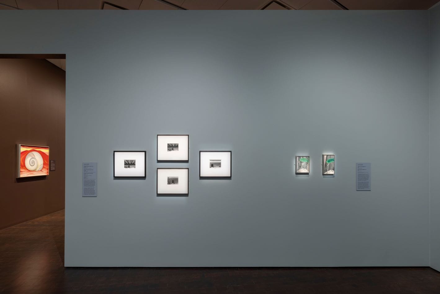 In each section, selected O’Keeffe paintings accompany the photographs to illustrate the section’s theme. In Reframing, we see “Shell and Old Shingle No. I” (1926), a still life in which the viewer clearly sees a leaf and a shell. Next to it, we see “Shell and Old Shingle No. III” (1926), nearly the same painting, however with a shift of perspective so that it becomes a landscape: the shingle becomes a rock face and the foregrounded shell, a shadowy desert mound. In these captivating moments, O’Keeffe’s photography comes alive in her paintings.