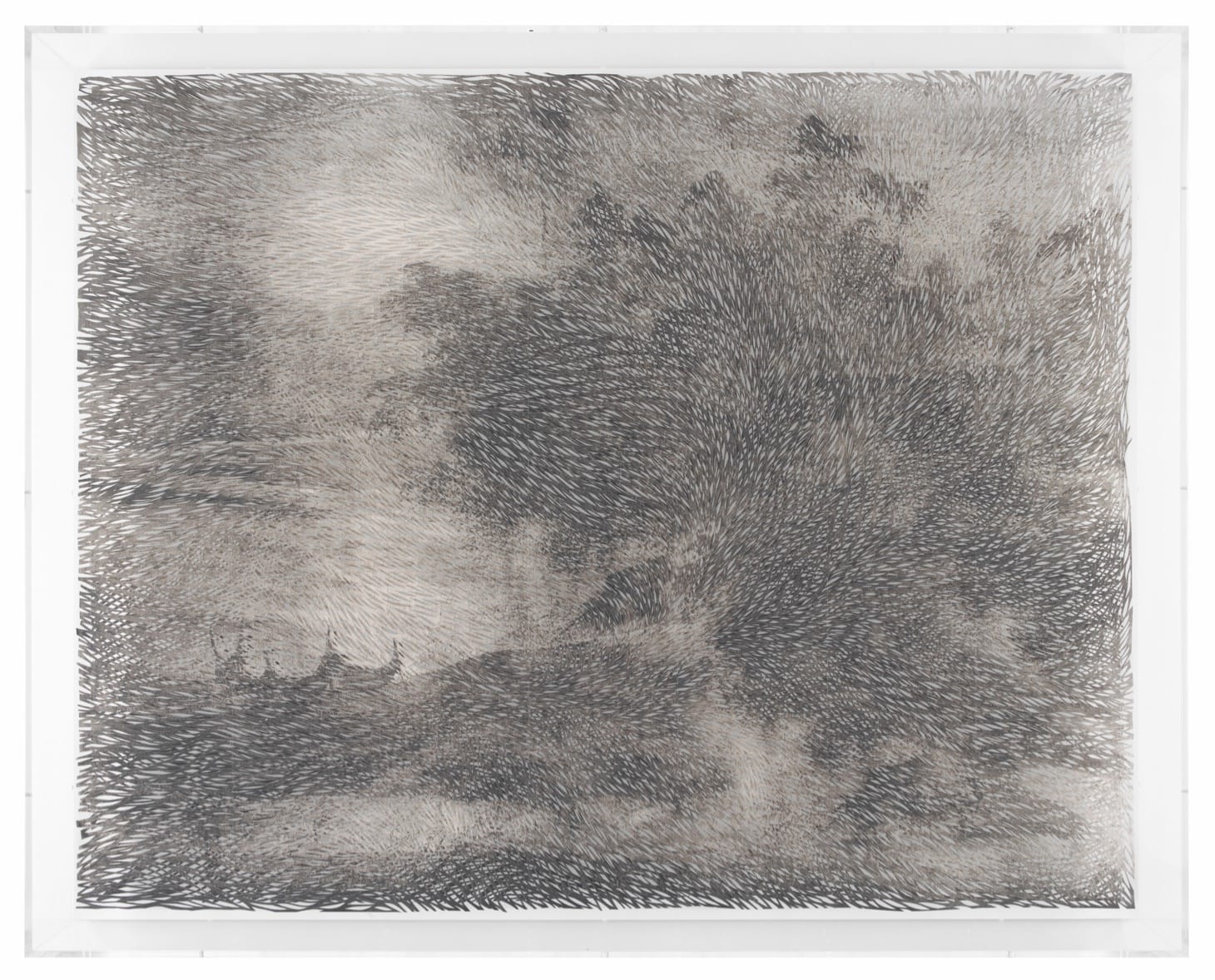 MAASTRICHT, The Netherlands — It has been said that the last thing a fish understands as it dies suffocating after being pulled from the sea is that it lives in water. Georgia Russell’s work of a cut print on paper made of Kozo fiber, “Fishing Nets” (2018) might be a vision of what I fish would see as it lays gasping for breath at the bottom of a net. It’s a swirl of sea and air and maybe a patch of sun. Possibly it’s a deep darkness that fitfully clouds this vision as a permanent night encroaches. Or it might be that Russell has made the work a window into a littoral zone where seaweed swims up and effloresces into mushrooming shrubs and the horizon disappears within a domain where all is motion. Still, there are what looks like boats visible in the gloaming, their bows, sterns, and sails curving like cursive vessels surfing the waves.