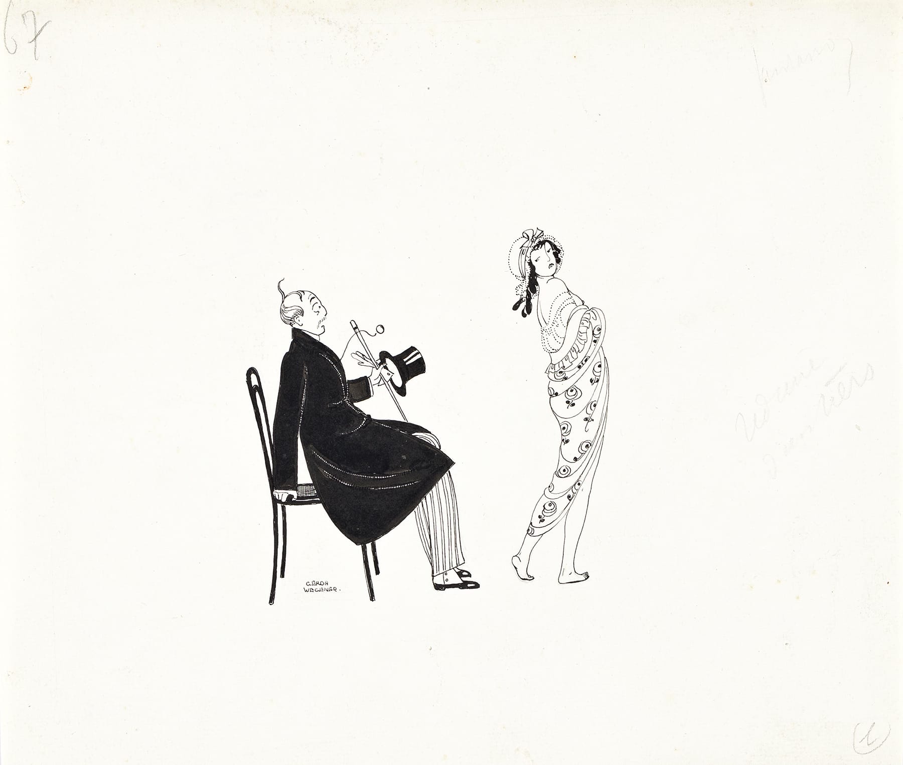 In Denmark, a major cultural critic had called Wegener's drawings “Gerda Wegener’s sleazy regiment.” In France, however, the artist found commercial and professional success. She won two gold medals — and one bronze — at the French Pavilion of the World Fair in 1925, and from 1923 to 1932 the French state purchased three of her portraits, which can be found today in the collection of the Centre Georges Pompidou in Paris. Commissions, too, were frequent. In addition to designing glass mosaics for wealthy clients and making advertisements for feminine products including stockings and face cream, Wegener regularly illustrated magazines such as La Vie Parisienne, La Baïonnette, Le Rire, and even the limited-edition, high-end culture magazine Journal des Dames et des Modes, where her pochoir prints appeared alongside those of leading illustrators such as Umberto Brunelleschi and Georges Lepape. In the midst of painting portraits and making colorful fashion plates, Wegener drew erotic illustrations, many of which took Lili as a model. In 1925, for example, she collaborated with French poet Louis Perceau to elaborately illustrate Les Délassements d’Éros, a book of poetry, with watercolors that featured lesbian and queer sex, often among androgynous or chimerical figures.