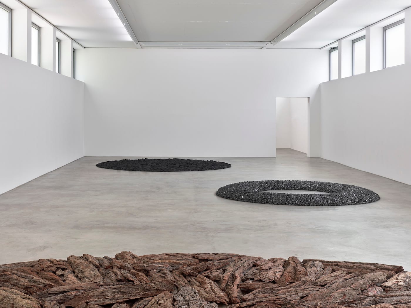 A striking installation by acclaimed British artist Richard Long highlights the raw material of coal. To set up the sculpture, organizers of The Black Side brought in a ton of anthracite coal from the mine at Ibbenbüren, one of the two remaining active mines in Germany, which will close down in December. Long arranged the coal on the floor in three circles, which seem incongruent in an indoor gallery space. In their circularity, they evoke how the past and the future are fused together. Neatly arranged, dense and dark, they emphasize the beauty of raw coal, the blackest of black.