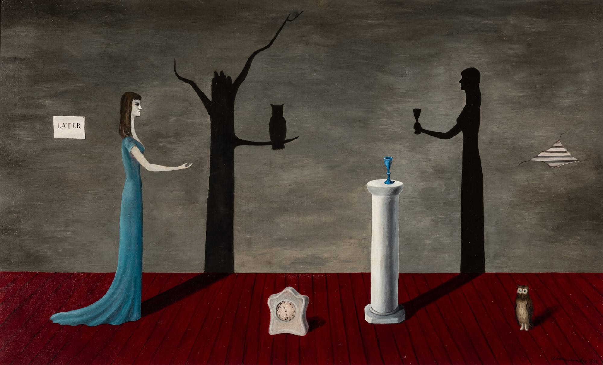 Abercrombie’s influences are clear, but like any great artist, she forges this disparate tangle into something unique. Her shadows, lines, and contorted perspectives evoke Giorgio de Chirico, while her colors and smooth surfaces, as well as her placement of regular objects in incongruous settings, recall René Magritte, whom she specifically mentioned in interviews. “Strange Shadows (Shadow and Substance)” (1950) exemplifies her style. A tall and thin woman in a turquoise dress, presumably the artist’s double (she appears in many compositions), holds her hand aloft, but the shadow she casts is of a tree with an owl on a branch. Across from her, a smooth, white column with a blue glass placed atop it casts a shadow in the silhouette of a woman holding a glass. Stark and strange, the painting conjures her influences but is unmistakably Abercrombie’s, the autobiographical figure so common in her work infusing the painting with the witchy, occult, hermetic sensibility that she cultivated.