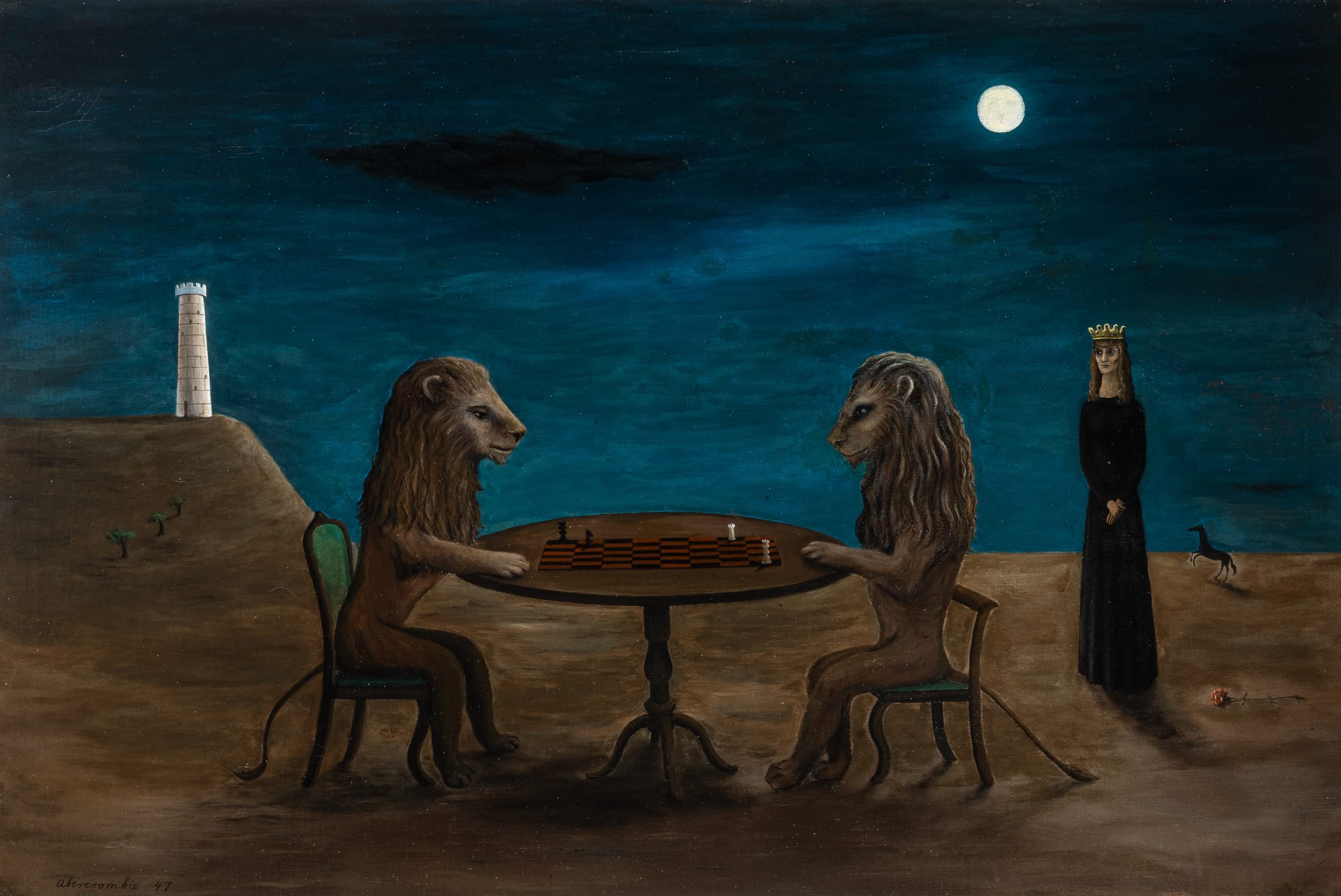 Part of the uncanniness of Abercrombie’s works paradoxically arises from the mutedness of her surrealism: Despite the occasional lions playing a game of chess, there are no melting clocks or locomotives emerging from fireplaces. The disquieting dream logic of an Abercrombie composition instead seems designed to unnerve more than to shock, a quintessentially American imagination that’s less Salvador Dali than it is David Lynch. For that matter, despite her own claims of having been influenced by Stein, the literary modernist Abercrombie most resembles is another Pennsylvanian poet: the hermetic, occult prophetess H.D. Like H.D., Abercrombie is an artist whose storehouse of images is personal and eccentric, for both are creators of a mythopoesis in some ways inscrutable and impenetrable — but all the more alluring because of it. “At least I have the flowers of myself,/and my thoughts, no god/can take that,” H.D. wrote in her 1917 poem “Eurydice.” Those words apply equally to the painter.