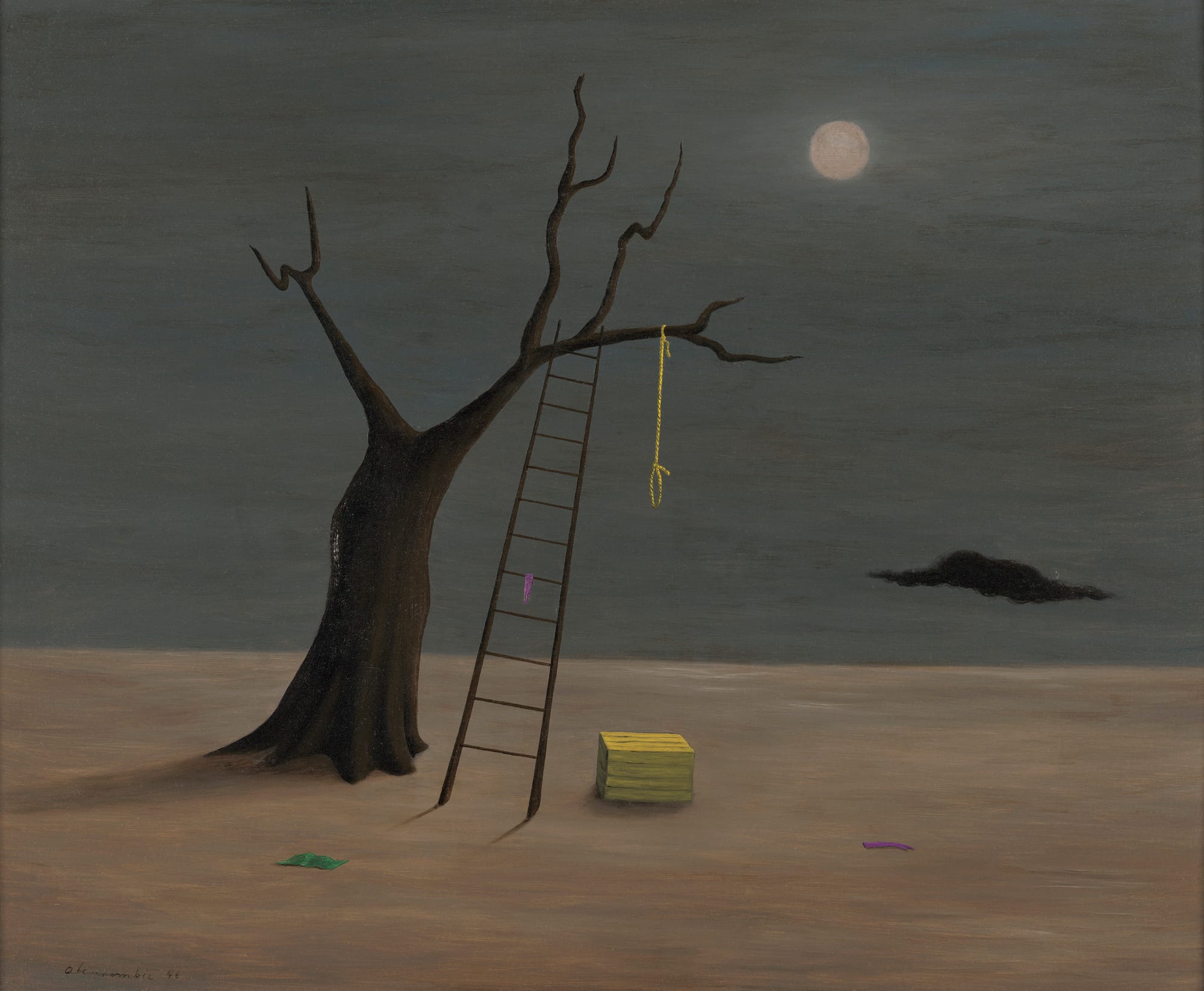 Surprisingly, the artist Abercrombie reminded me of most wasn’t Joan Miró or Man Ray — not even Leonora Carrington — but rather a surrealist of a different sort in the children’s book illustrator Clement Hurd, celebrated for his pictures in Margaret Wise Brown’s classic Goodnight Moon (1947). Both have a fondness for deceptive simplicity and clean lines; both are conversant with the charged mysticism of powerful archetypes and of lonely fields on a moonlit night. Such a comparison isn’t to Abercrombie’s detriment, but rather to Hurd’s elevation. More importantly, it speaks to a certain shared Americanness between them — while Abercrombie never denied her similarity to the Surrealists, her own program was fundamentally hers alone, a rugged individualist on a psychic errand into the wilderness. What Abercrombie’s work exemplified was her own principle of the “point of contact,” the place where subjectivities collide, even if they aren’t mutually comprehensible. A point of contact makes a space for communication — not in spite of, but because of the mysteries of personhood. The Carnegie’s enigmatic exhibition, threaded through with Abercombie’s repeating motifs of night and the moon, ladders and doors, exemplifies such communication. It’s an experience that feels as much as having your Tarot read as it does a trip to the museum.