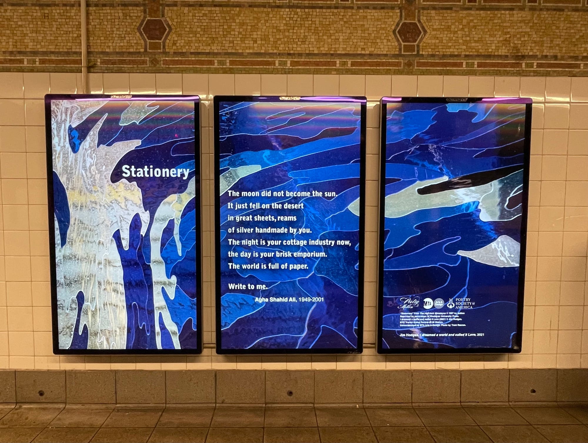 The two new poems, selected by MTA Arts & Design in collaboration with the Poetry Society of America as part of the “Poetry in Motion” series, are Agha Shahid Ali’s “Stationery” and Timothy Liu’s “The Lovers.” Each of the texts are paired with illustrations of artwork in the MTA Arts & Design collection.