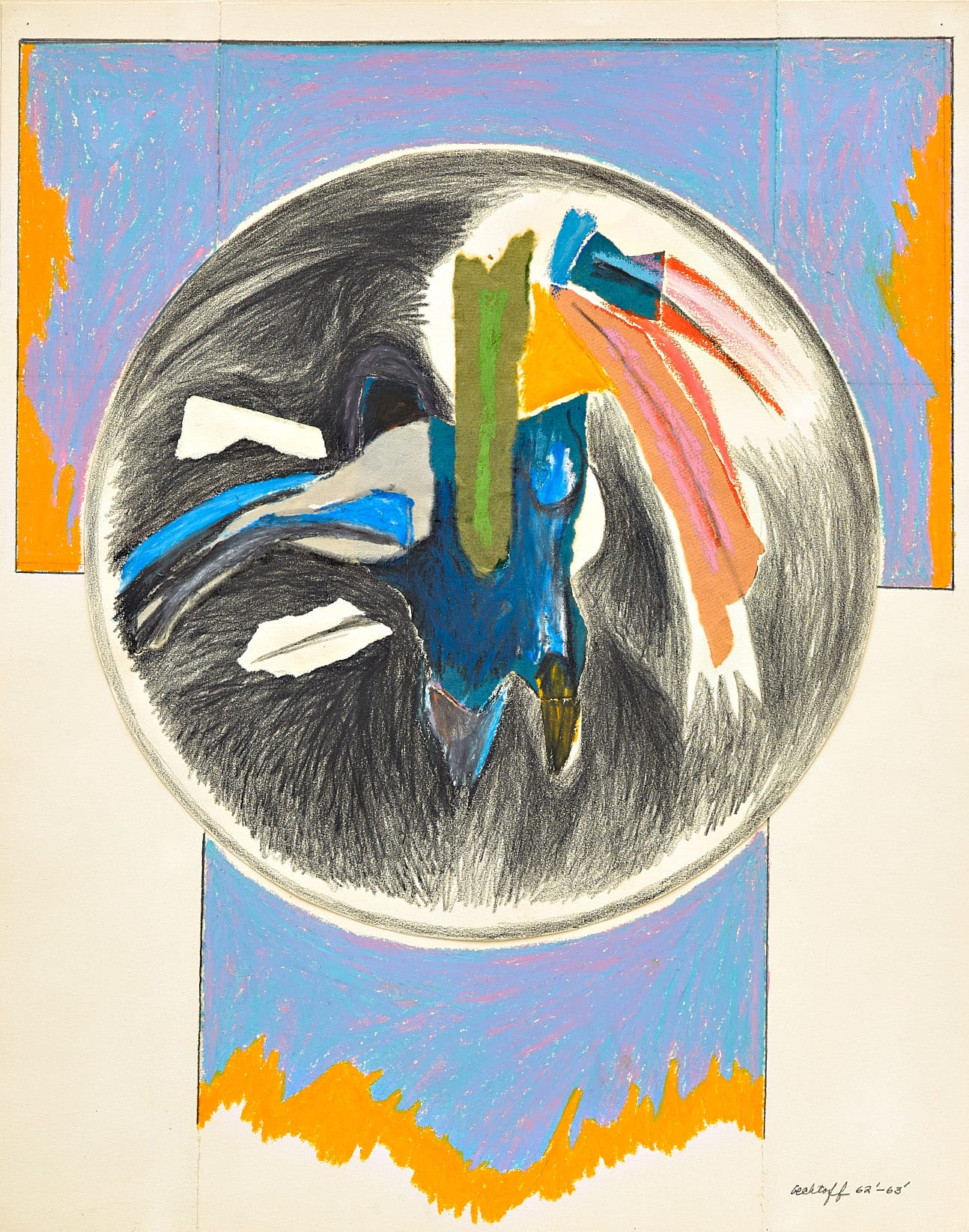 During the 1960s, Gechtoff (by then in New York) stopped applying impasto brushstrokes with a palette knife. Her turbulent gestural drawings, dense with lines, began to swirl into a circular form, as seen in the drawing “Circle 1” (graphite on paper, 26 by 19 inches, 1962). I wonder if this shift had to do with her childhood: Gechtoff’s parents were Russian-born and her father, Leonid Gechtoff, who encouraged her to paint starting at the age of five, was a well-regarded genre painter. Gechtoff grew up in Philadelphia surrounded by Russian icons, which may have influenced her color choices and attraction to abstract forms, especially the circle, which is regarded by many cultures as sign of divinity and rebirth.