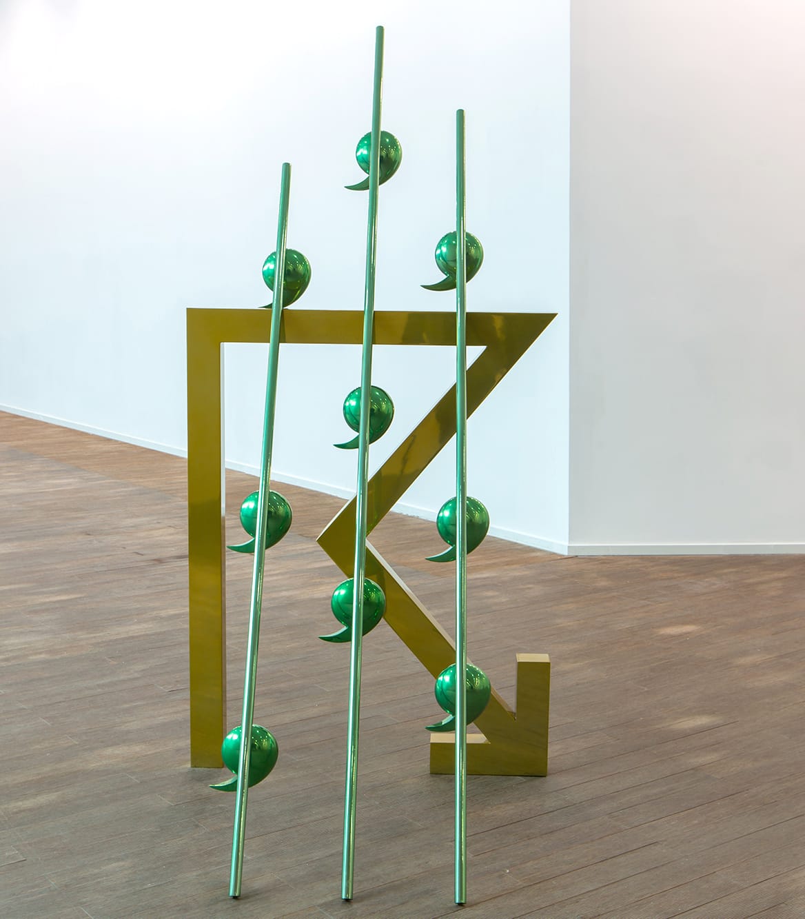 Humor can perhaps convey a more effective sense of the distance between our ant-like human lives and the larger climatic forces threatening the viability of those lives as we’ve known them. Smartly situated in the same room as Graves’s and Harvey’s paintings, Swedish duo Bigert & Bergström’s sculptures, “The Russian Campaign 1812” and “Teutoburg Forest 9 CE” (both 2017), depict weather events that influenced the course of military history as pop-camp versions of weather report graphics. The shiny and colorful painted stainless steel objects—a group of Shamrock green bars from which dangle apostrophe-shaped raindrops; silver, asterisk-shaped snowflakes clustered on the floor—playfully send up the way in which meteorology’s visuals abstract weather from its harshest historical and experiential consequences.