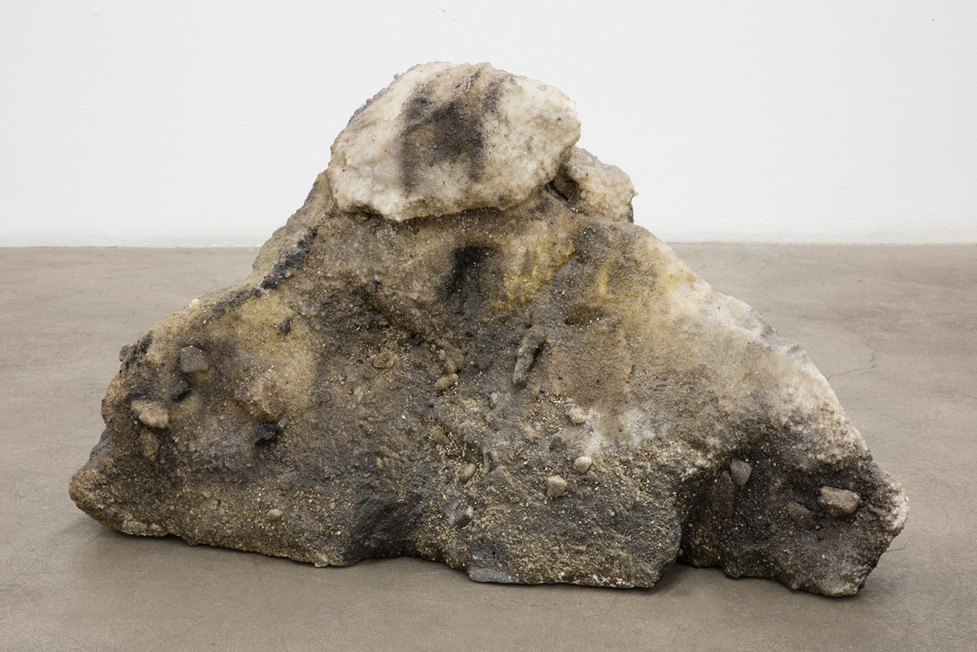 Josh Callaghan’s Chicago Snow (2013) series portrays one such human-scaled consequence with understated humor. The small, jagged foam sculptures are coated with resin, sand, and other materials to resemble partially melted clumps of polluted snow. Encountered on a gallery floor rather than a city sidewalk, the lifelike clumps are droll, uncomfortable reminders of urban pollution’s normalization. Similar to Ishii’s nearby cloud/breath grid, Chicago Snow commingles the celestial with the terrestrial, the natural with the anthropogenic; however, unlike “The Breath from Which the Clouds are Formed,” there’s a conspicuous contrast here between weather in its pristine state and weather covered in our species’ grimy fingerprints.