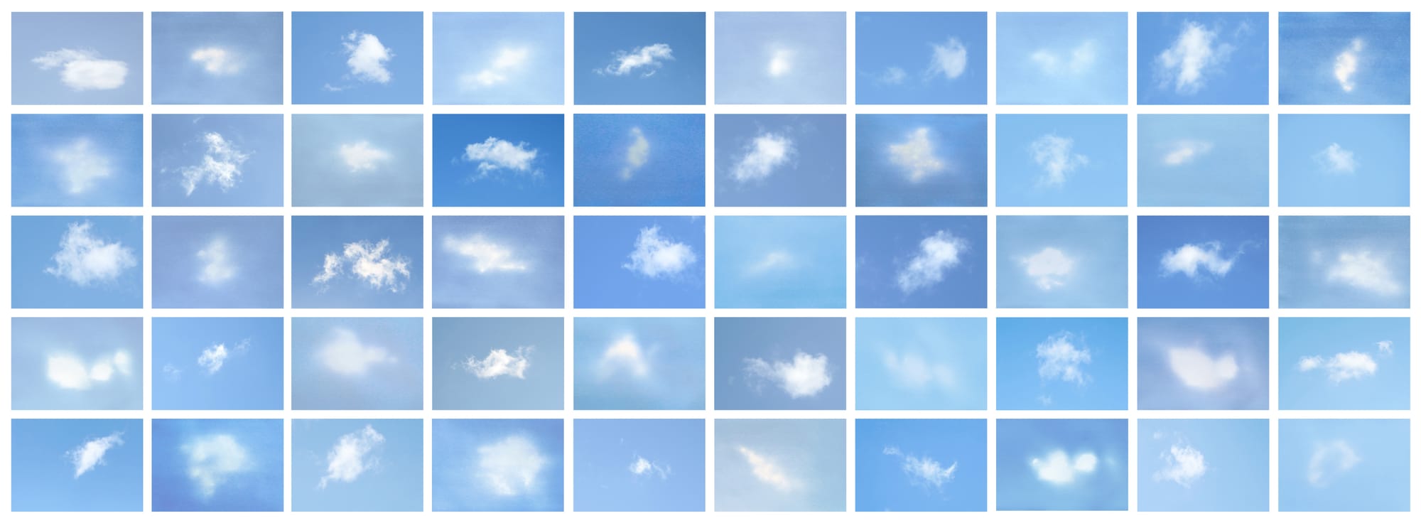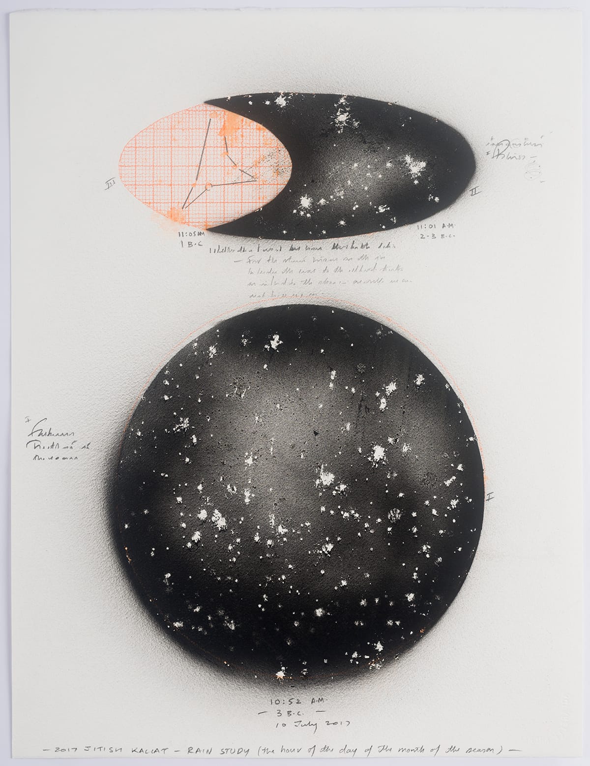 The row of Byron Kim’s beguiling, blue-and-white Sunday Paintings (2001–present) in the entry hallway sets a ruminative, airy tone. Each canvas in the ongoing weekly series offers a porthole-sized glimpse of one Sunday’s sky, overlaid with a diaristic handwritten paragraph overlaid. Kim’s deceptively simple play on hobbyist painting contrasts the quotidian vicissitudes of terrestrial life with the heavens’ gauzy indifference. Upstairs, Ayumi Ishii’s gossamer “The Breath from Which the Clouds are Formed” (2015) and Jitish Kallat’s shapeshifting Rain Study series (2017) also turn on subtle contrasts between above and below. The latter look like straightforward drawings of astronomical charts but the artist incorporates rainwater filtered through stencils to depict nighttime stars as splotches of negative space. The former artwork consists of a grid of 50 soothing digital prints, each apparently depicting a wispy cloud against a clear blue sky. However, only half the photographs depict actual clouds; the other half are of Ishii’s breath on paper treated with thermochromic pigment. The indistinguishability of the two subjects from one another posits the human breath as a pervasive, if modest and invisible, component of the planet’s atmosphere.