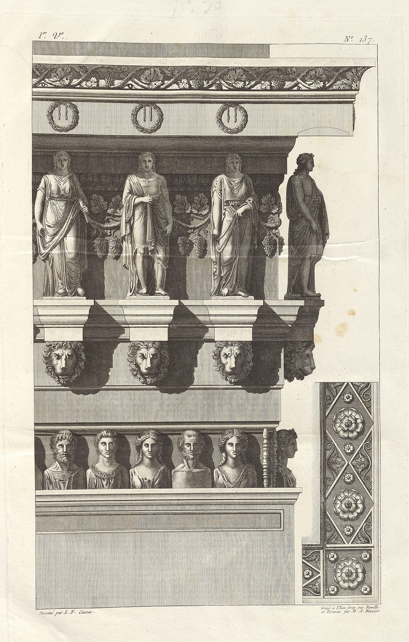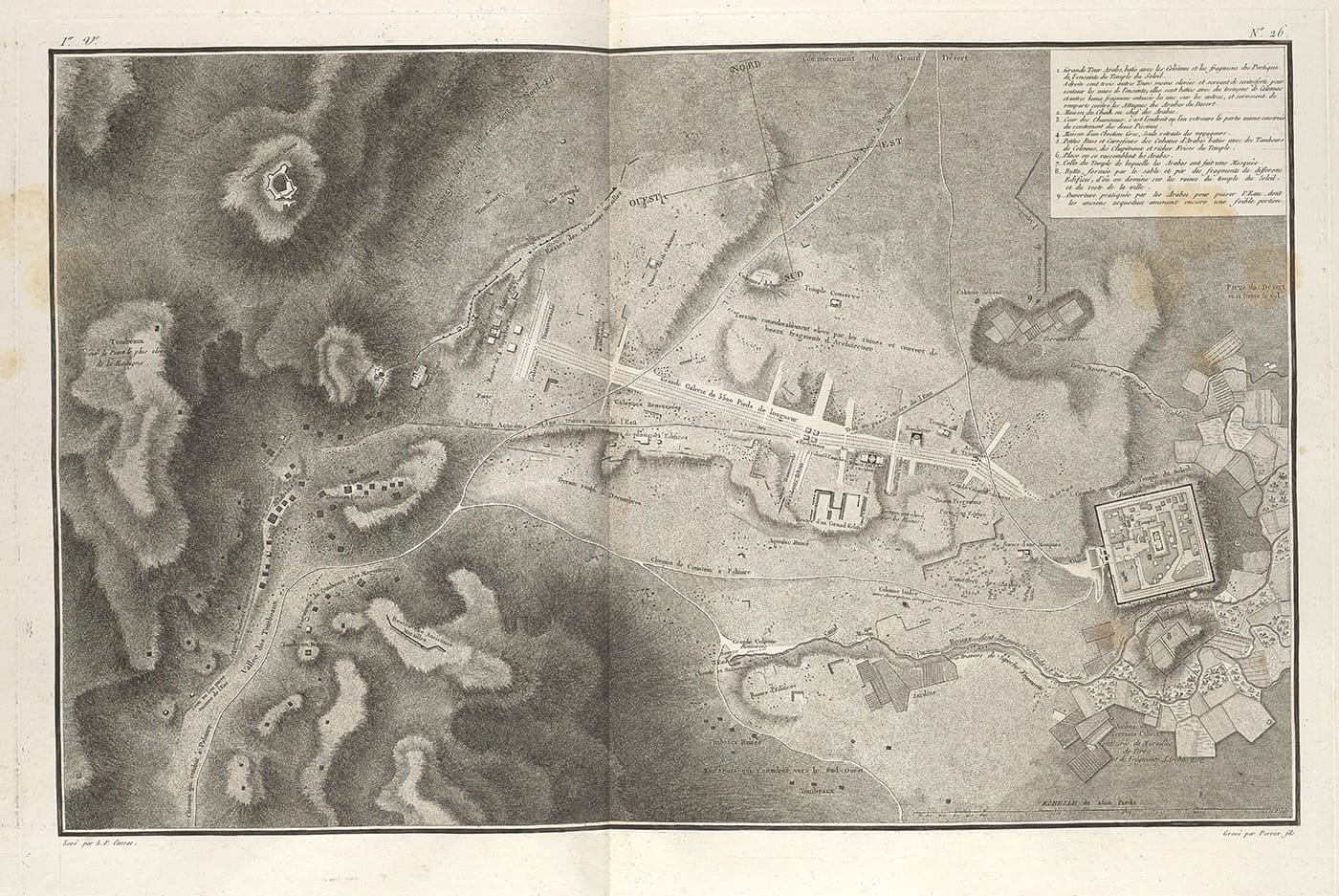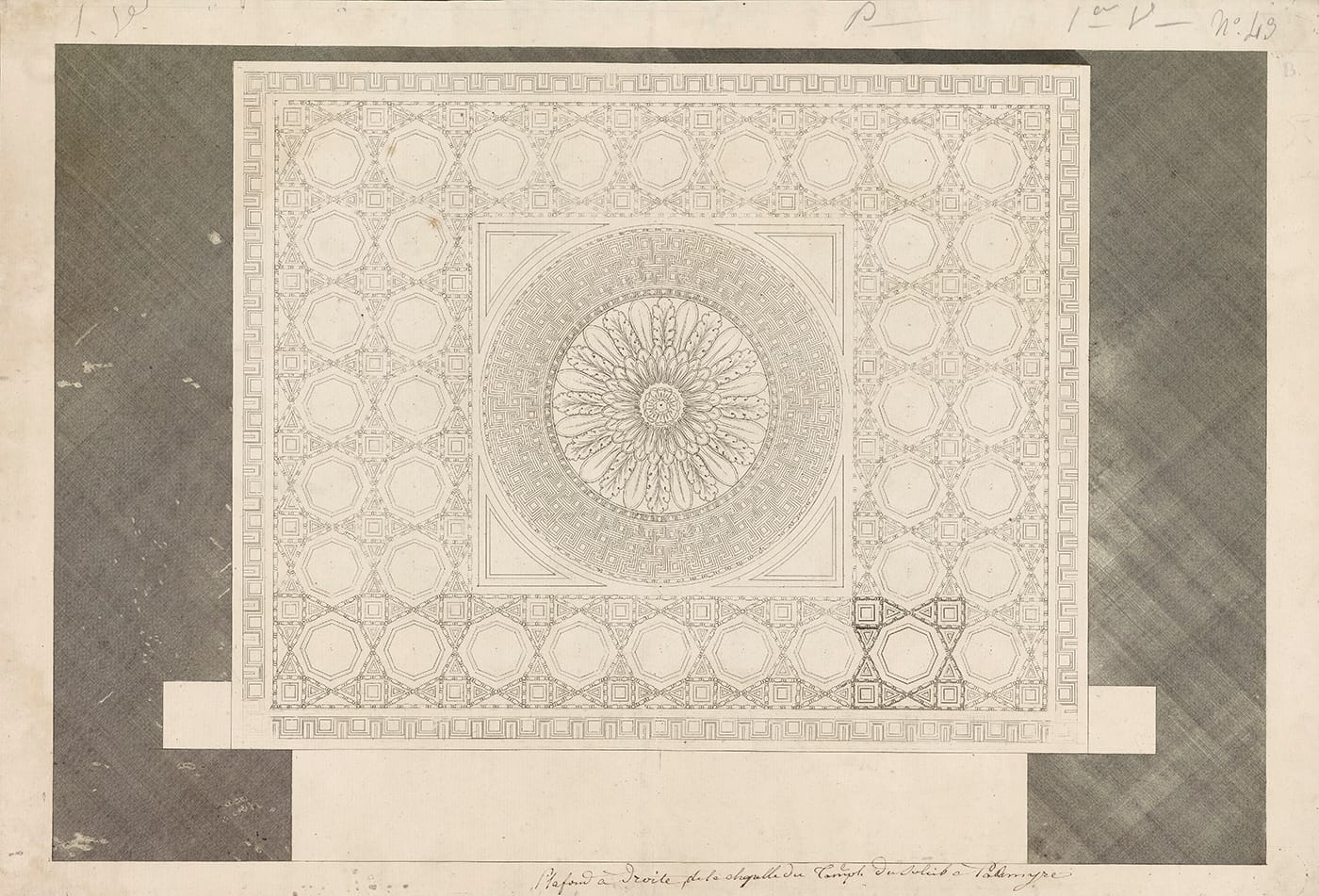 Vignes photographs are, of course, the most definitively accurate representations of a historic Palmyra, but other illustrations in the exhibition offer a glimpse of how the city may have looked — and how it was perceived by the artists and explorers who passed through it after its “rediscovery” by the West in the late 17th-century. After English traders in Aleppo undertook an expedition in 1691, Western scholars and travelers began arriving to see the wondrous metropolis and its Greco-Roman architecture with their own eyes. GRI’s archives contains many etchings of the ruins and of specific decorative details; many of these are rendered after the works of Louis-François Cassas, who arrived to Palmyra in 1785 and left with detailed notes recording his observations. He made over 100 large-format etchings of the site and produced an expensive but popular three-volume book. They are important documents to study, having gone on to strongly influence the architectural and decorative styles of Western Europe — they remind of how the legacy of Palmyra survives even in our built environment.