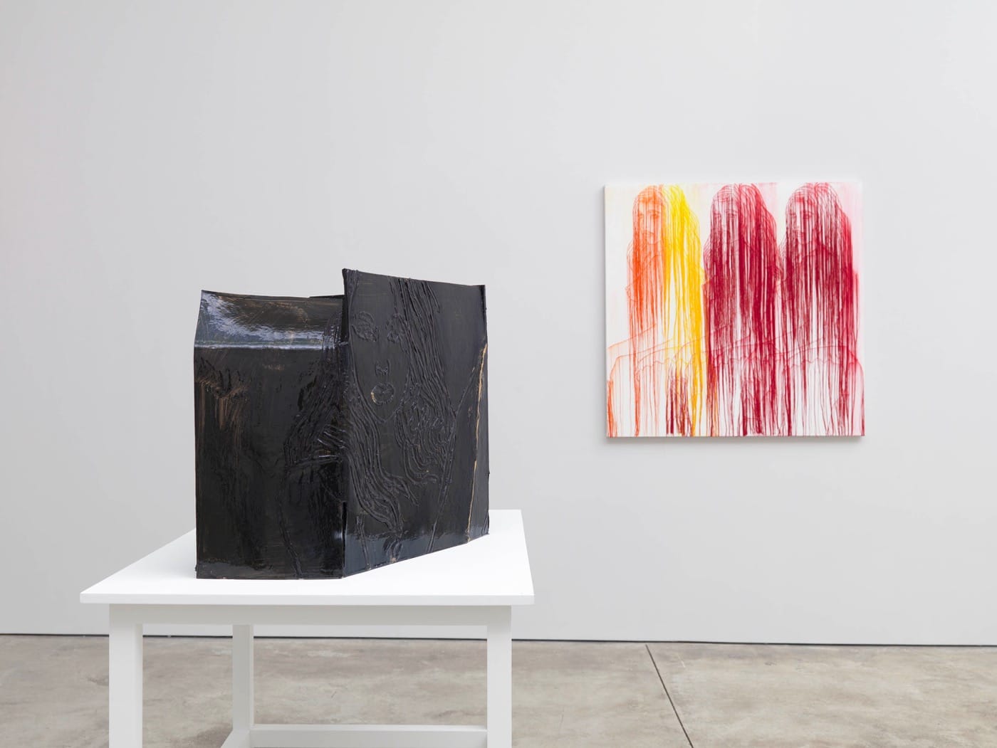 Like most of the rest of the paintings and images imprinted on ceramic sculptures Amer has here, the figures in “Women in White” are seductively posed, hips jutting and breasts bared as they look toward the viewer in poses that seem like they could be inviting or challenging. In the ironically titled 2017 pieces “Landscape with Black Mountains-RFGA,” and “Girl with Garden Carnation,” the invitation is made more explicit by having the figure’s vulva exposed to the viewer’s gaze. This work is an iron fist in a velvet glove.