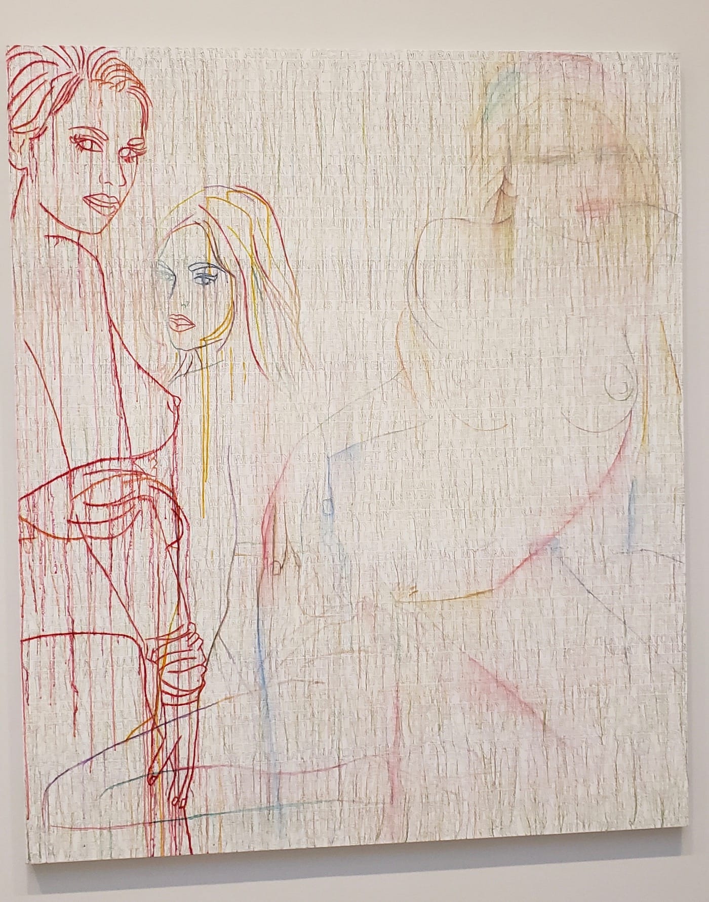 Ghada Amer, in her current exhibition at Cheim and Read, does something that formidable artists do: makes a proposal that is, in essence, unanswerable. In her 2016 painting “Women in White,” she combines outlines of women’s bodies made in acrylic with embroidery that hangs over the figures to make them washy and vague. Only when I get closer to the work do I see that all over the background she has stenciled in the repeating phrase: “I never thought it was fair that anatomy decided what my brain was fit for.” Here, the female figures are mostly naked, rendered in the style of idealized fashion sketches articulated with minimalist lines, a style that has long blurred the distinction between female and feminine.