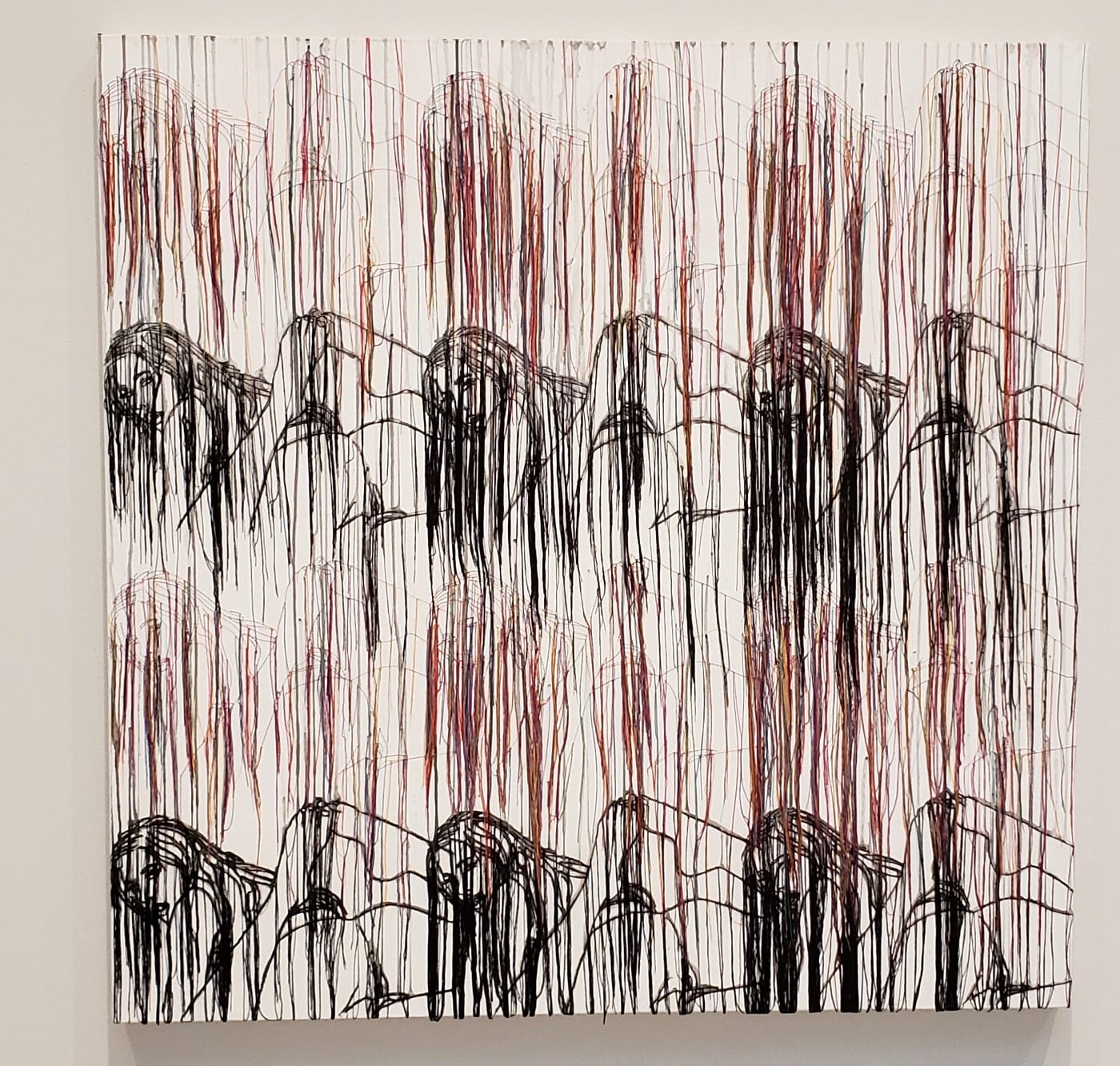 The combination of drawing and dangling thread that hangs over the portraits like a forest of vines or a cage of hair makes the work even more visually seductive. The tendrils slightly obscure the female figure and make her more desirable because she can’t be fully visually possessed. After all, we pursue that which flees from us. But here is the rub: it’s not the fault of anatomy. A woman’s body does not make the decisions regarding how she is represented nor seen. Rather, the culture around her body does this — a culture that makes her body into a territory to be conquered, a chance to be wooed, a citadel to be protected, a prize to be revered — all ways of diminishing the person to the mere status of an object of desire.
