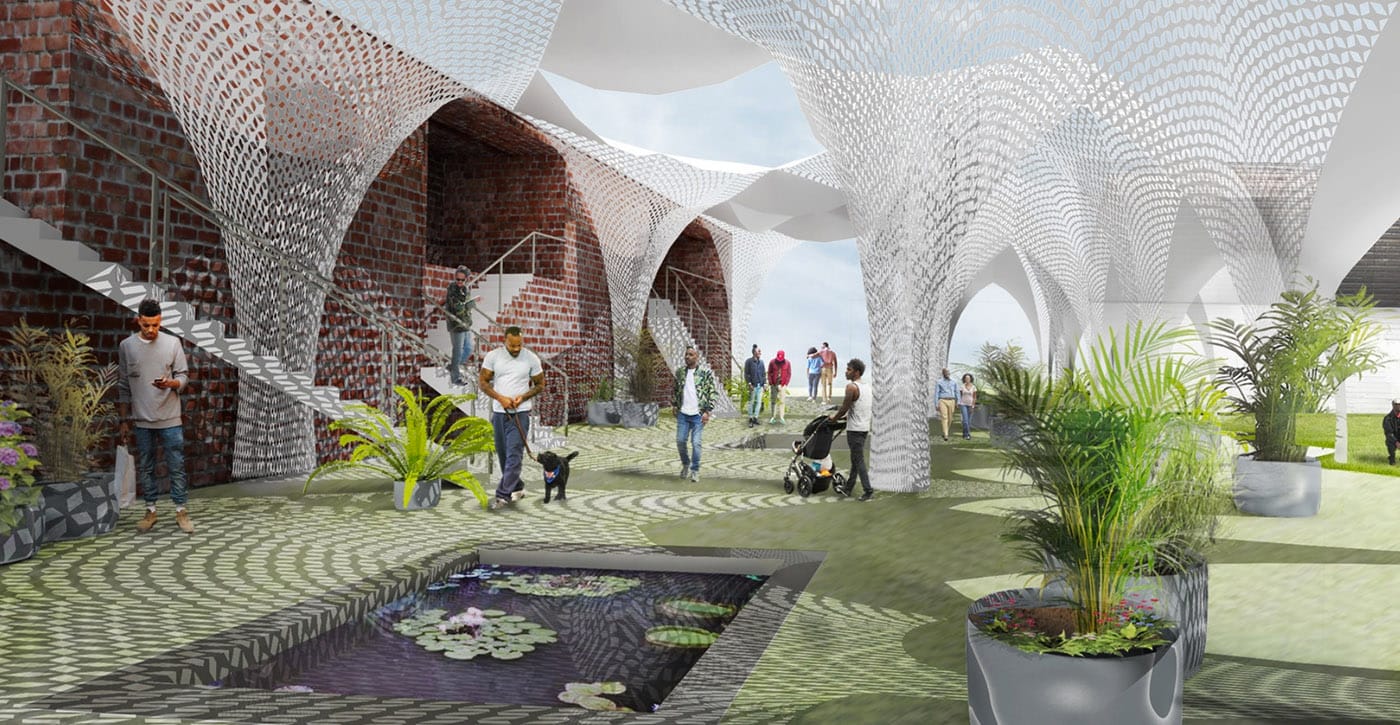 The Oakland Avenue project, titled “The American Riad,” seeks to create eight to ten units of affordable housing and six businesses that serve the needs of the North End, with proprietors interested in preserving the area’s history as a Black creative corridor. The courtyard will unify the corner with a public space for gatherings, workshops, gardening, performances, and displays of local and international art.