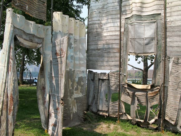An image has been with me for years since I saw it is Takashi Horisaki’s latex sculpture “Social Dress” (2007). Installed in an enormous, dimly lit warehouse space during Prospect One, curator Dan Cameron’s biggest-of-its-kind-in-the-US international contemporary art biennial, “Social Dress” is a full-size latex cast of a Lower Ninth Ward shotgun-style home that, like many homes, was demolished in Katrina’s aftermath. Paint chips and splinters stuck in the thick strips of latex, bits of mold, too, I’d guess — lodged in saggy rubber sheets hung in roughly the shape of a house. The effect was haunting. Was the latex like a cast, suggesting that New Orleans, with help, was healing? Was the latex, with its spectral droop and tiny, colored and discolored fragments of a house that once was suggesting that New Orleans, like most other places, was now just a few bits of “local color” suspended in a gooey, sterile mix of nostalgia and science? Was the latex, with its reddish-white hue, one more ghost of many — here just to become one more haunt in a city filled with spooks? Or was the latex, in almost every sense a negative of a space once used to live, just like a photogram, bearing silent witness, an impression, and an outline. The latex panels rustled deadly in the cavernous darkness of the warehouse, the silence did not yield an answer.