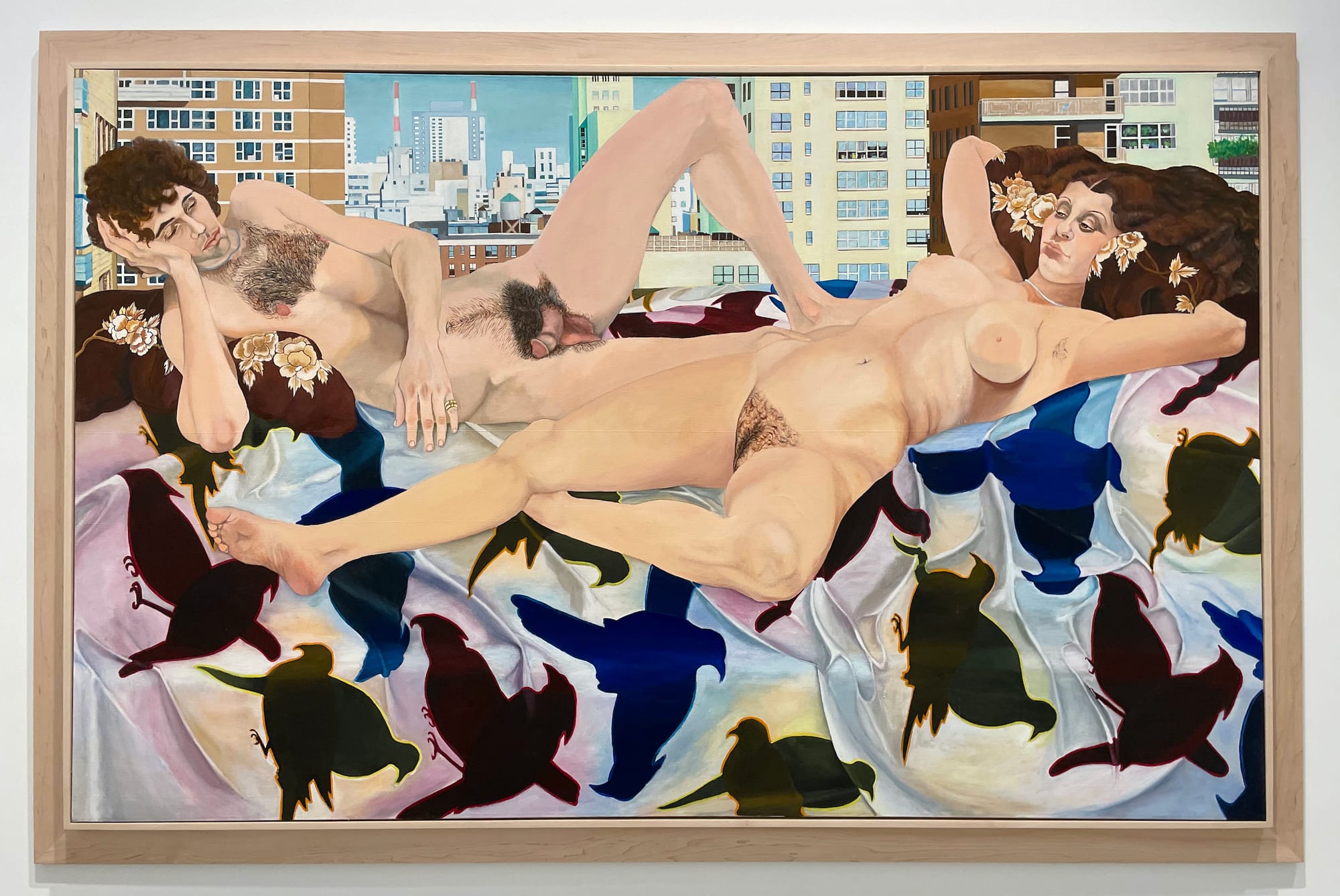 Even Joan Semmel’s erotically charged art is strangely cold here. Two intertwined crimson bodies crowding the space are bordered by clammy turquoise. Three women are sketched atop the main image, all looking sullen, as if we’re witnessing the afterlives of the sexual encounter.